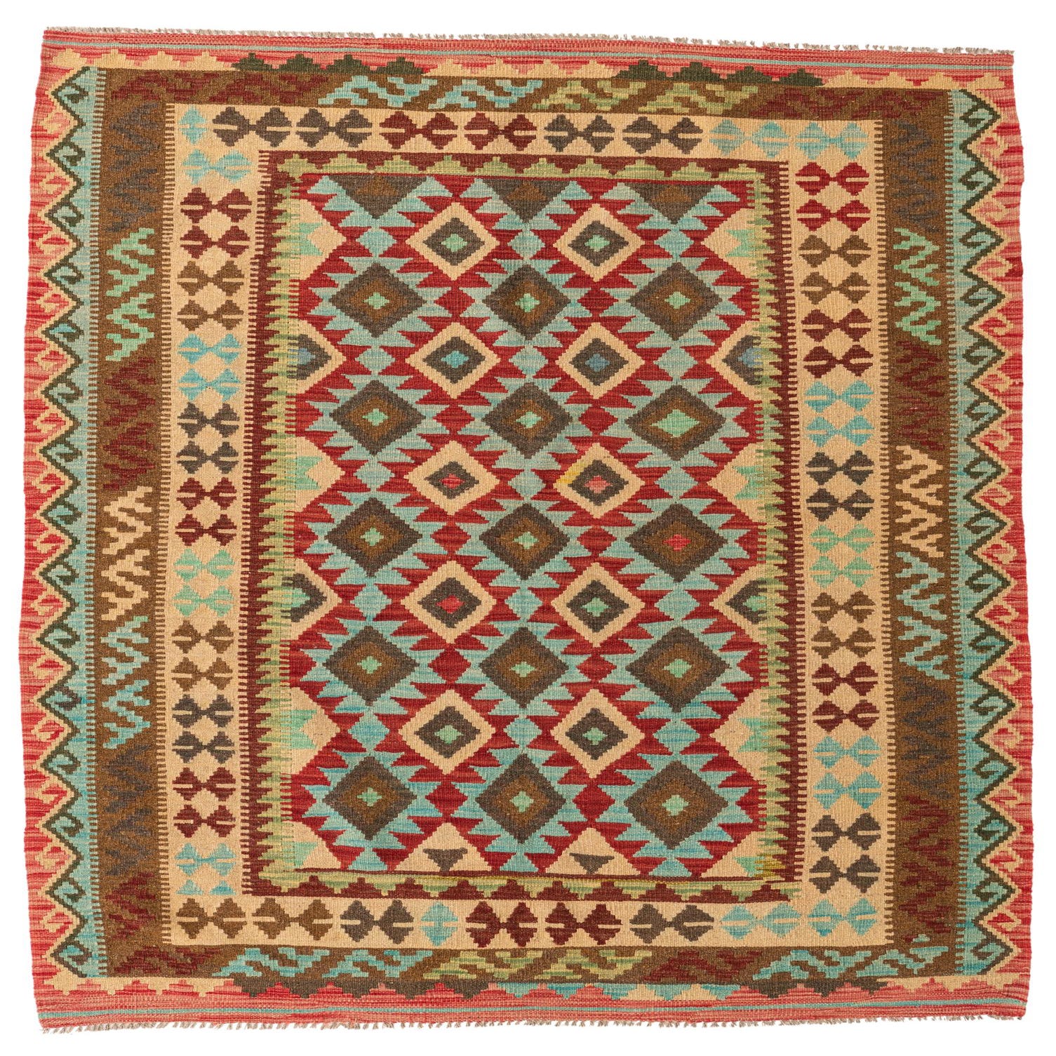 Primary color is Red. Colors in this rug include: Red, Beige, Blue, Olive, Light Green.