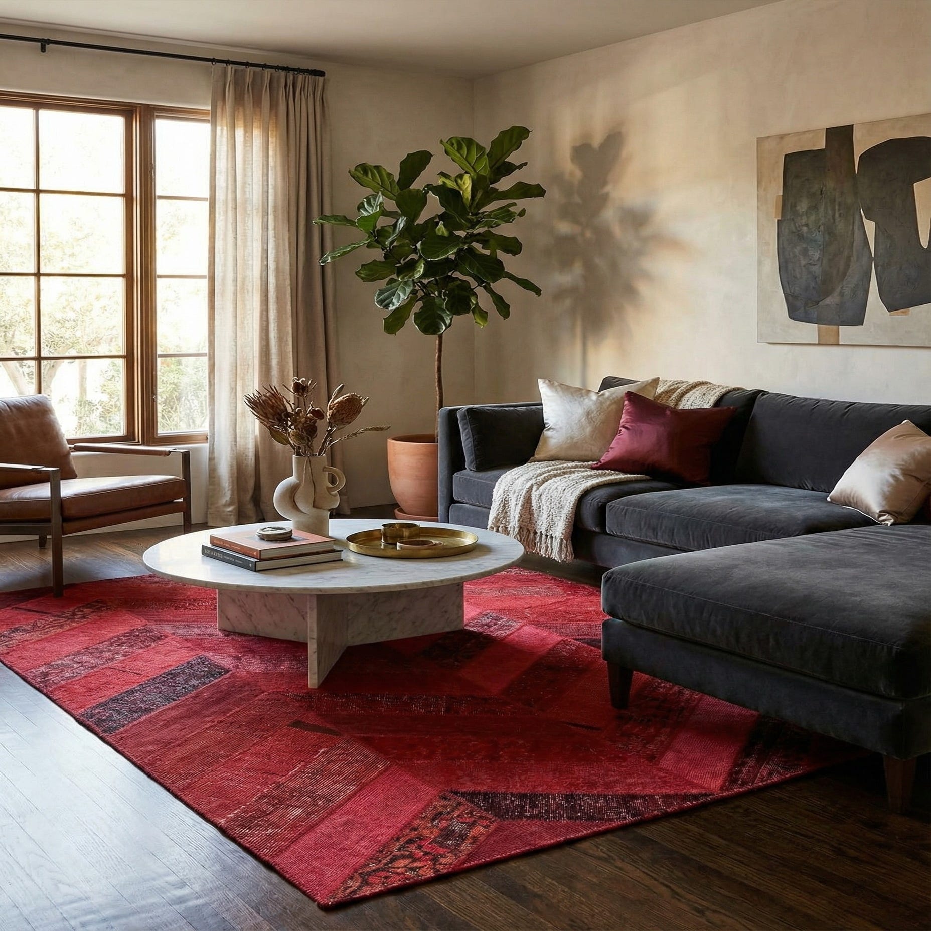 Primary color is Red. Colors in this rug include: Red, Black, Burgundy.