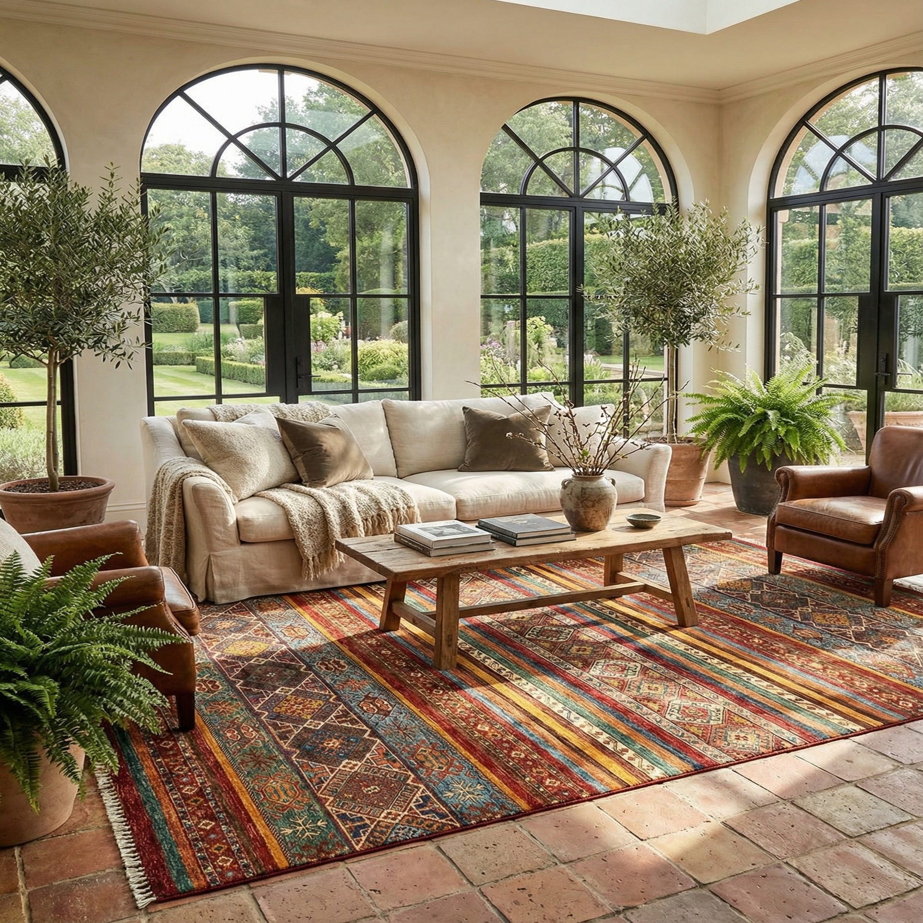 Primary color is Red. Colors in this rug include: Red, Blue, Brown, Cream, Olive, Green, Orange.