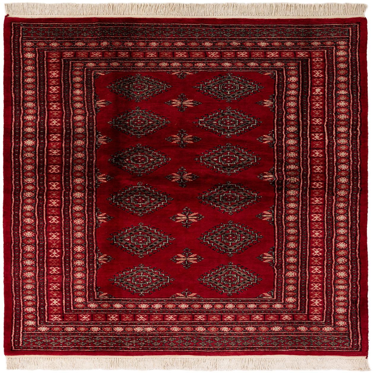 Primary color is Red. Colors in this rug include: Red, Black, Ivory.