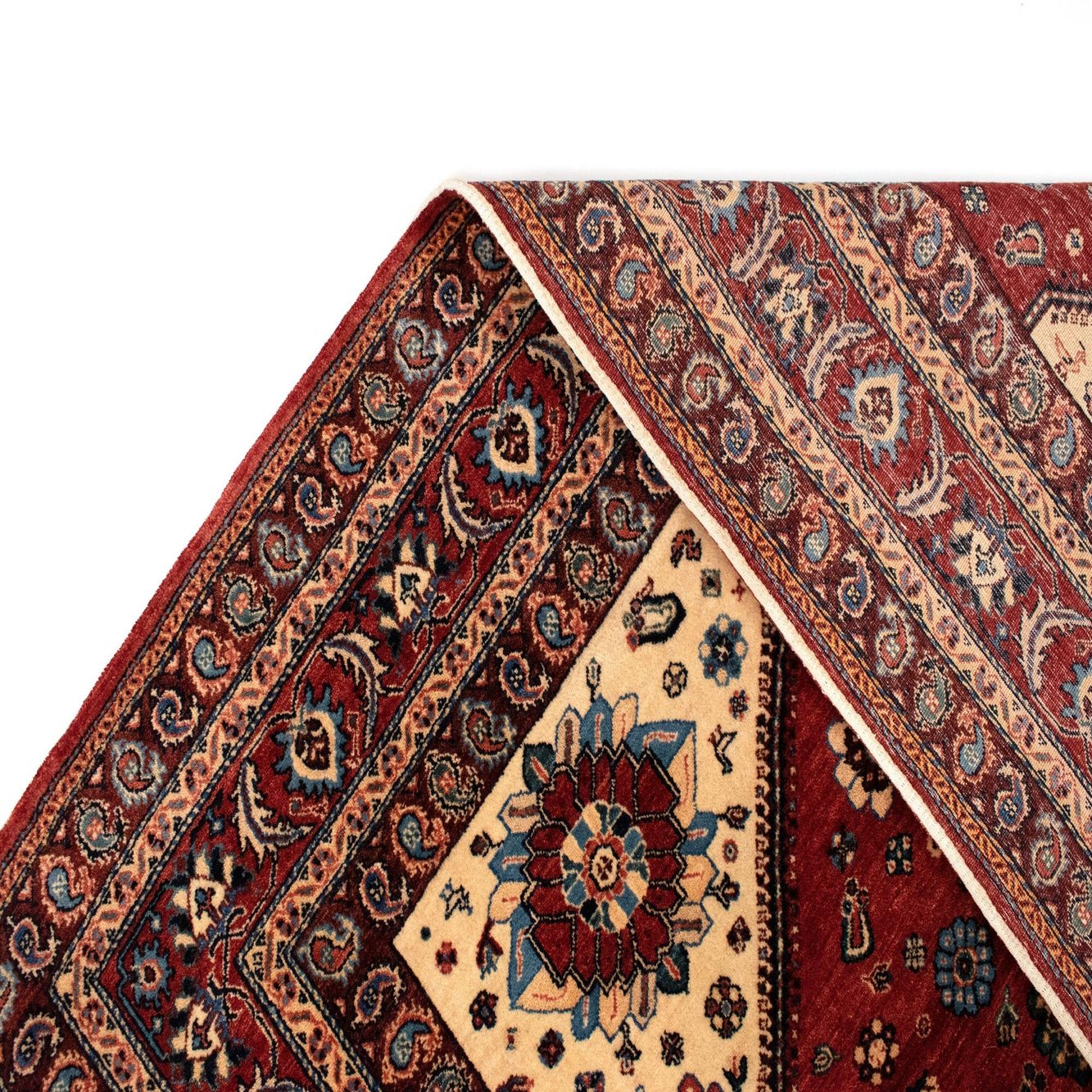 Primary color is Red. Colors in this rug include: Red, Beige, Blue, Brown, Dark Blue.