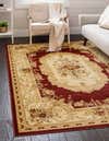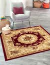 Primary color is Red. Colors in this rug include: Red, Brown, Candy, Cream, Green, Rust Red, Tan.