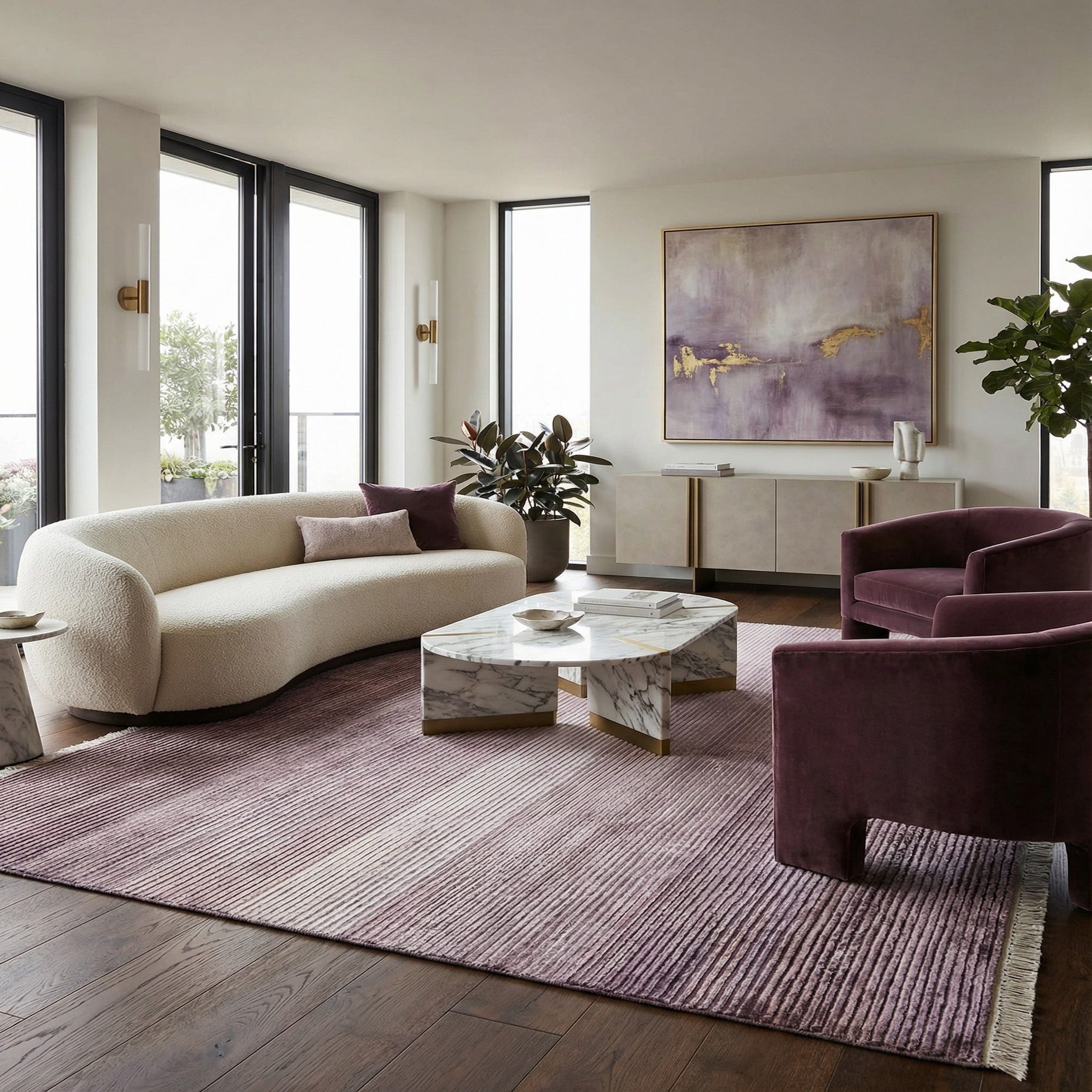 Primary color is Red. Colors in this rug include: Red, Peach, Puce, Purple.