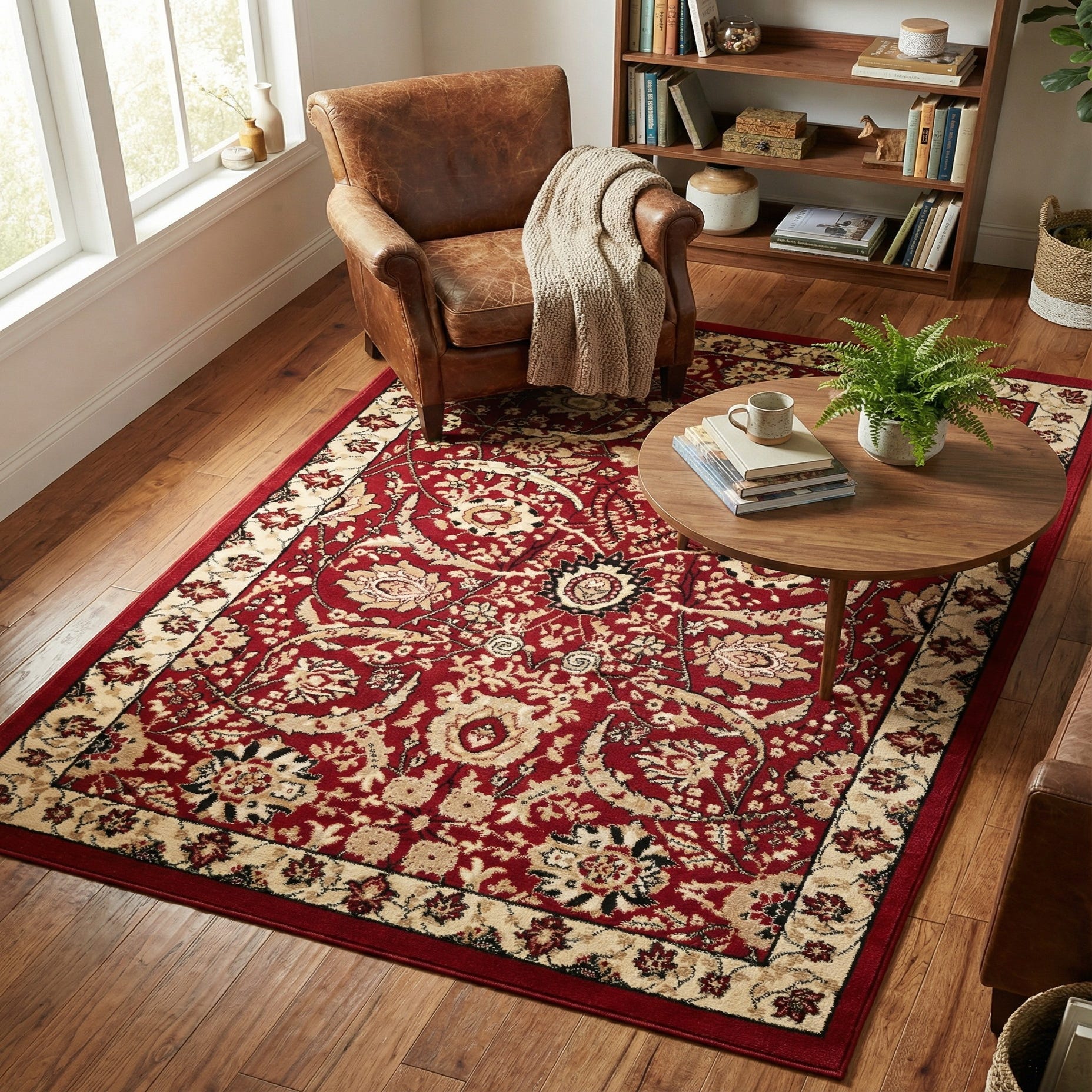 Primary color is Red. Colors in this rug include: Red, Beige, Black, Cream, Tan.