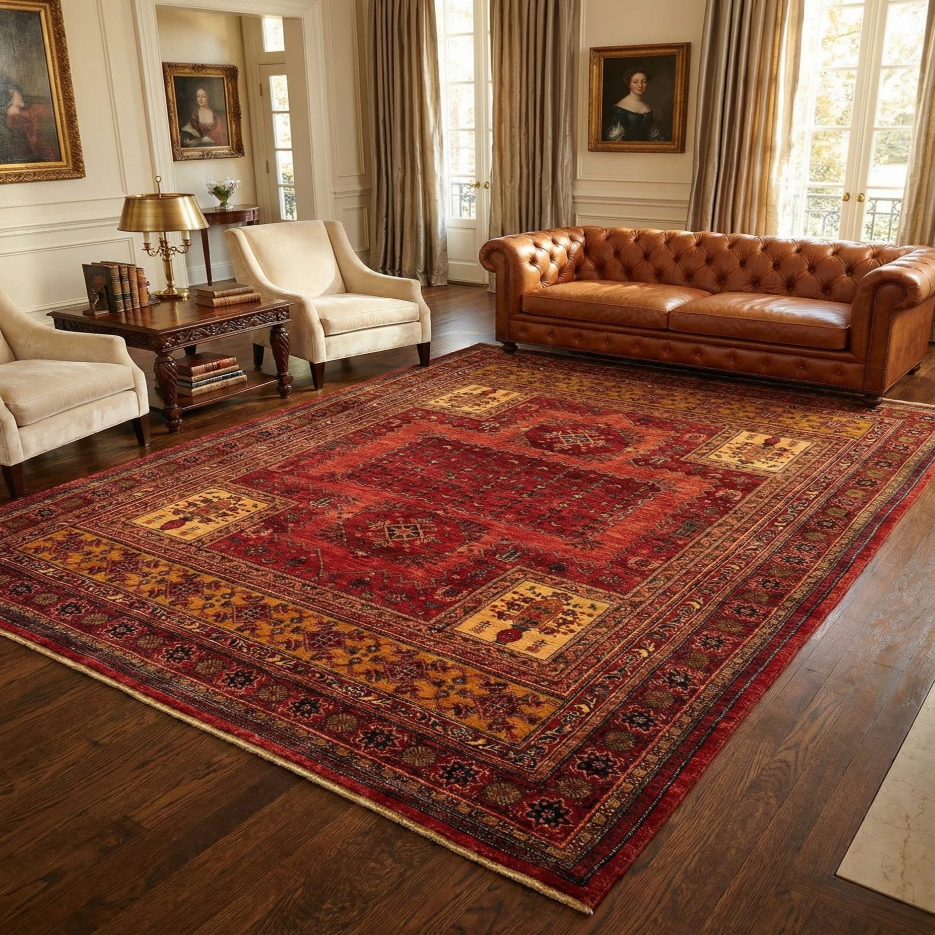 Primary color is Red. Colors in this rug include: Red, Brown, Orange, Beige.