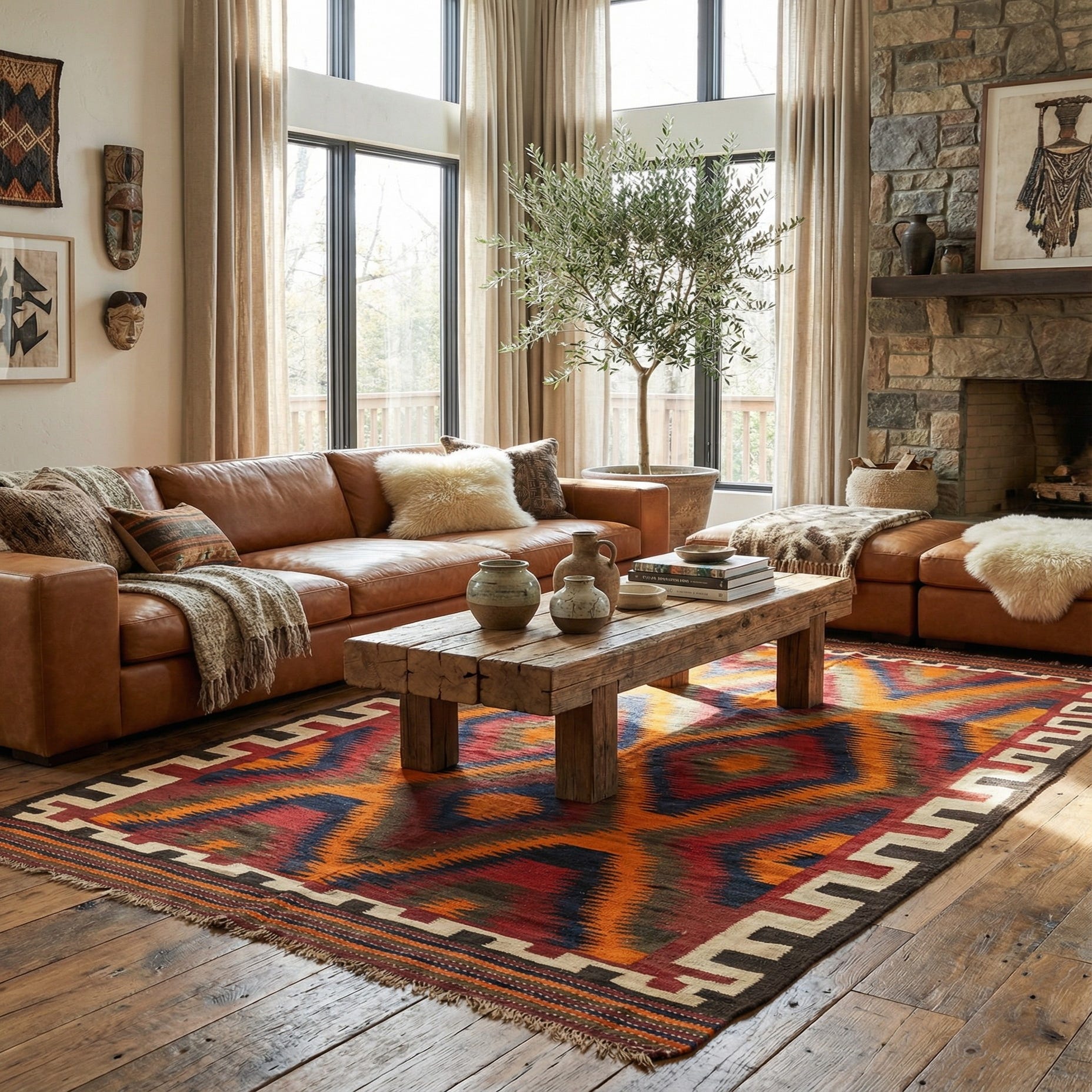 Primary color is Red. Colors in this rug include: Red, Brown, Ivory, Orange, Navy Blue.