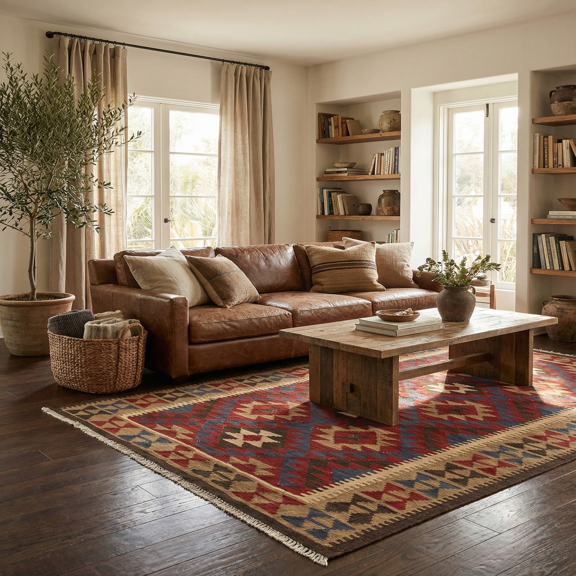 Primary color is Red. Colors in this rug include: Red, Beige, Brown, Cream, Navy Blue.