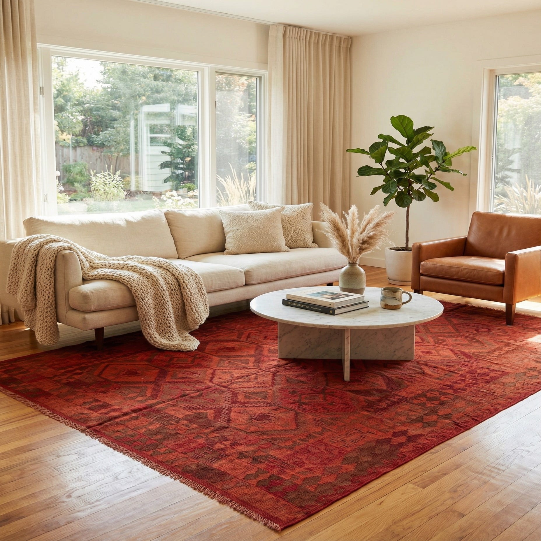 Primary color is Red. Colors in this rug include: Red, Brown.
