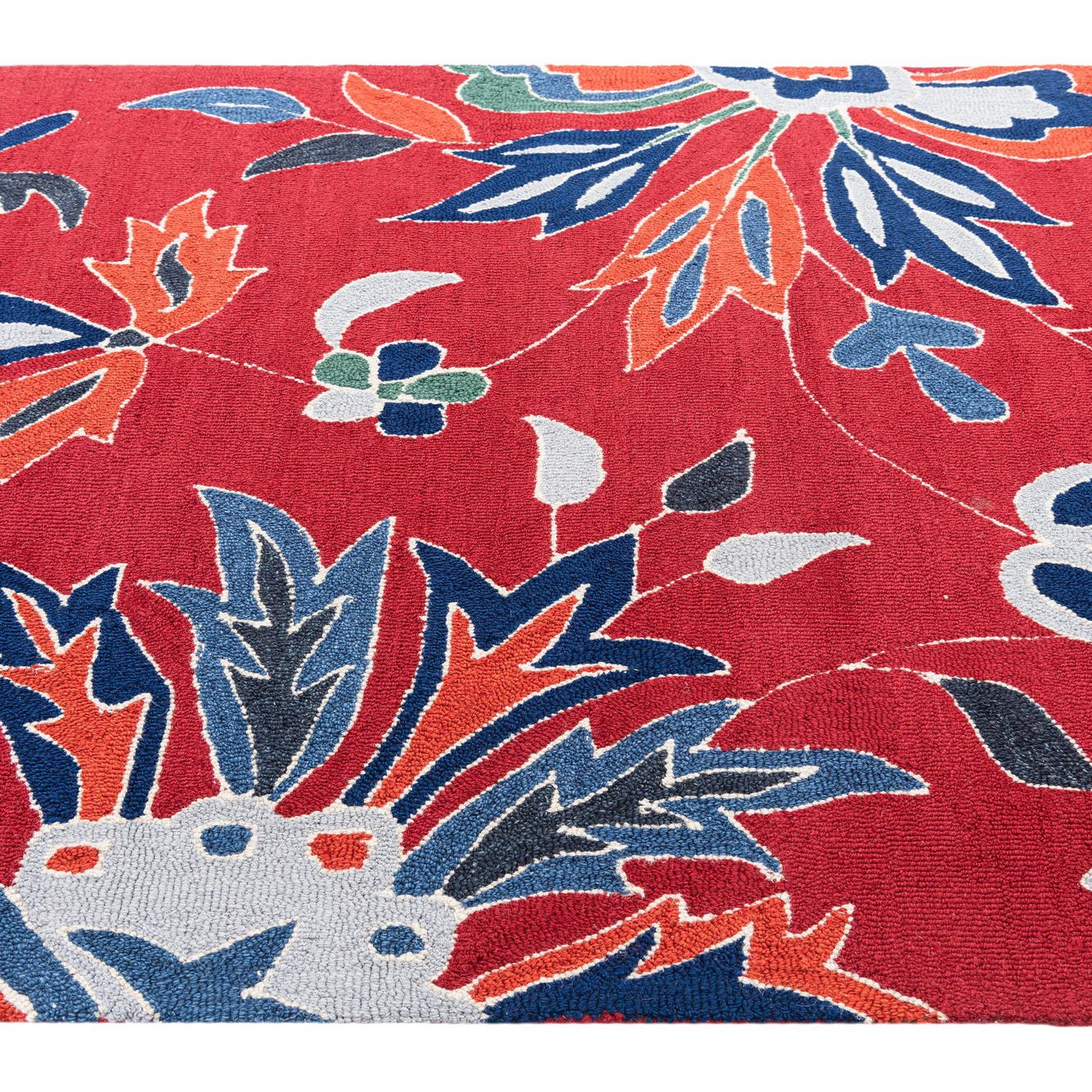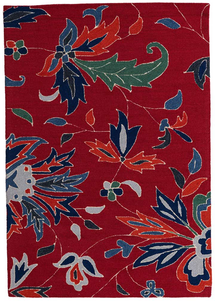 Primary color is Red. Colors in this rug include: Red, Ivory, Navy Blue, Orange, Gray, Green.