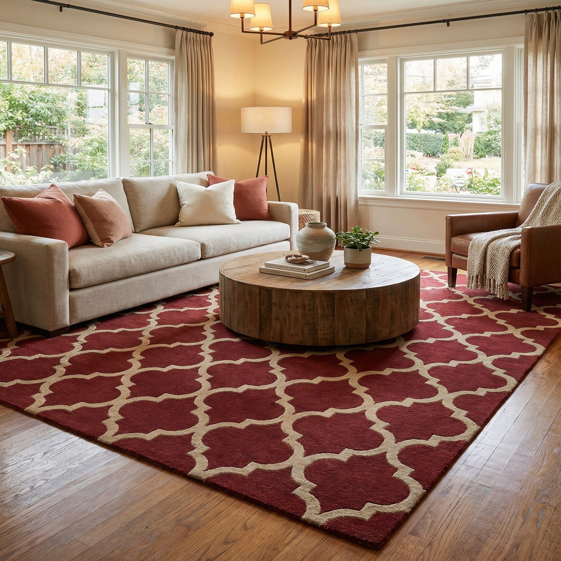 Primary color is Red. Colors in this rug include: Red, Ivory.