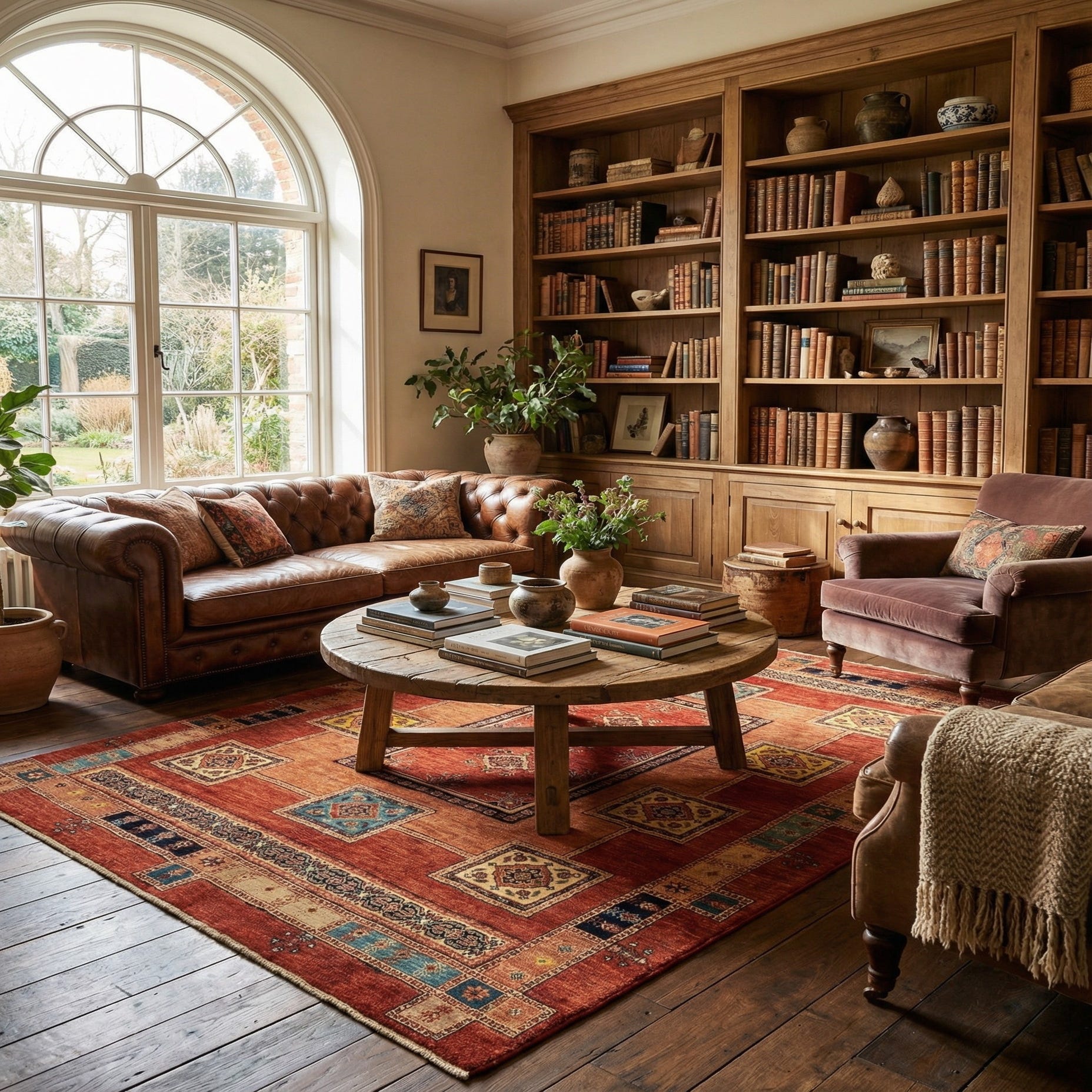 Primary color is Red. Colors in this rug include: Red, Red, Orange, Yellow, Green, Dark Blue.