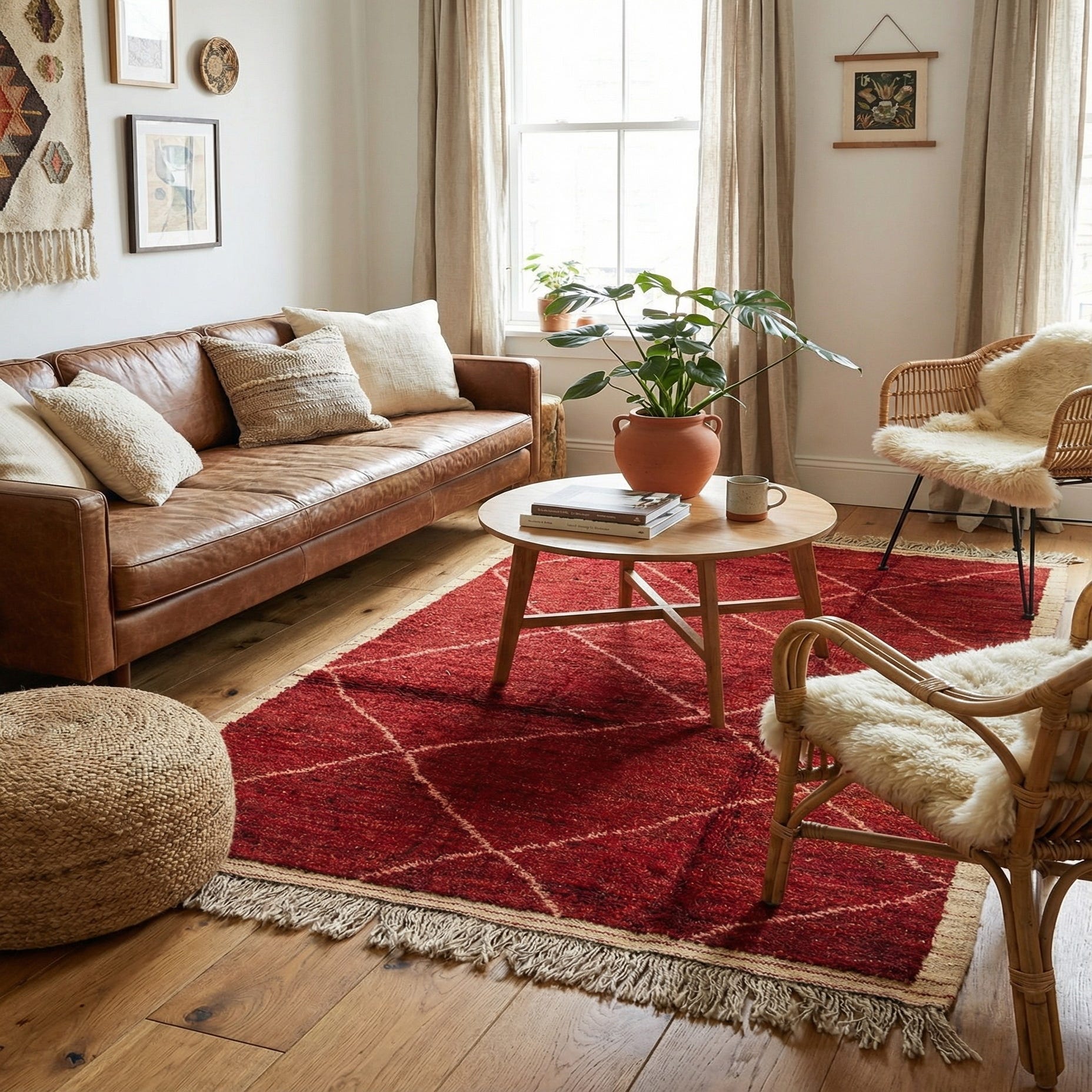 Primary color is Red. Colors in this rug include: Red, Beige, Black.