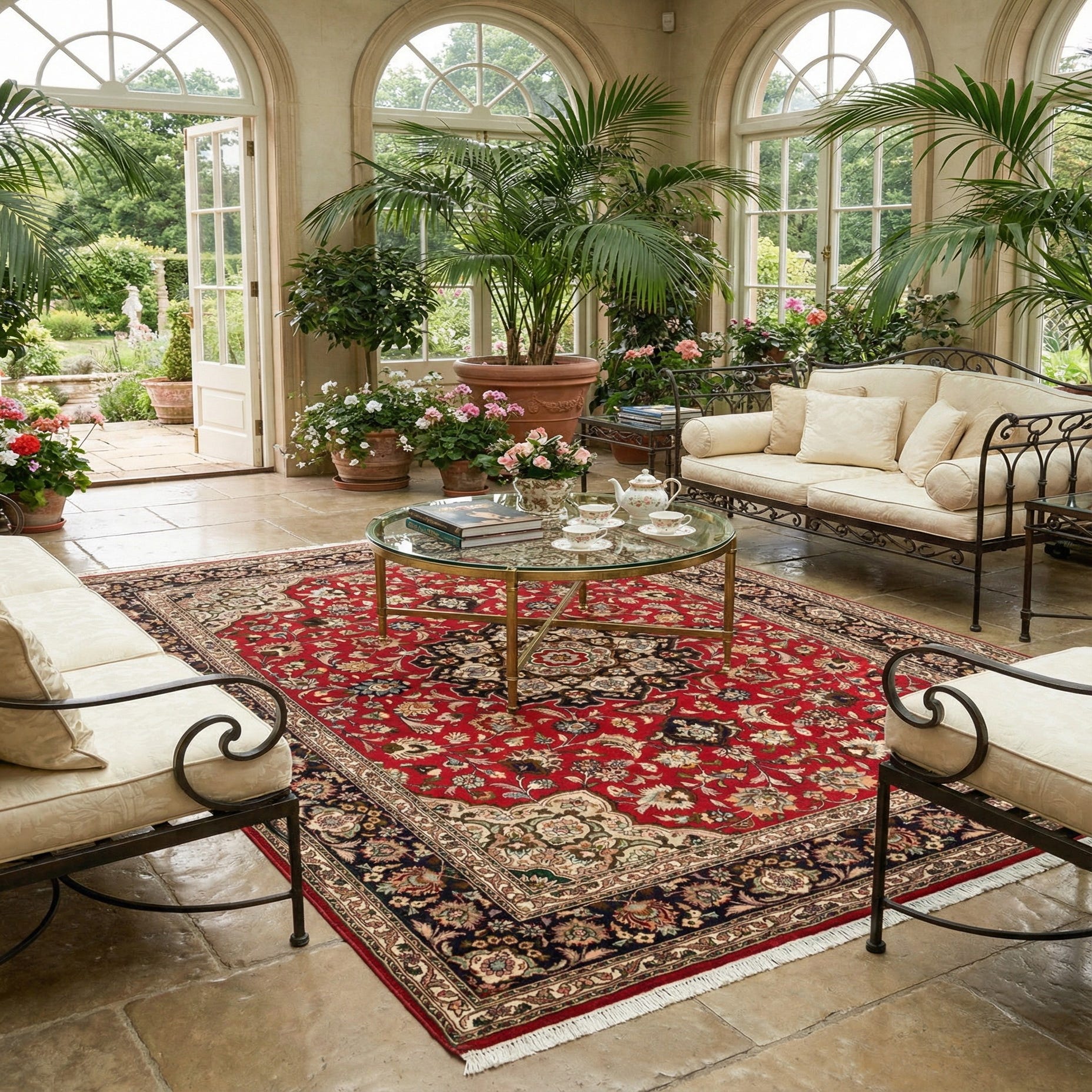 Primary color is Red. Colors in this rug include: Red, Red, Beige, Dark Blue, Brown, Green, Blue, Green.