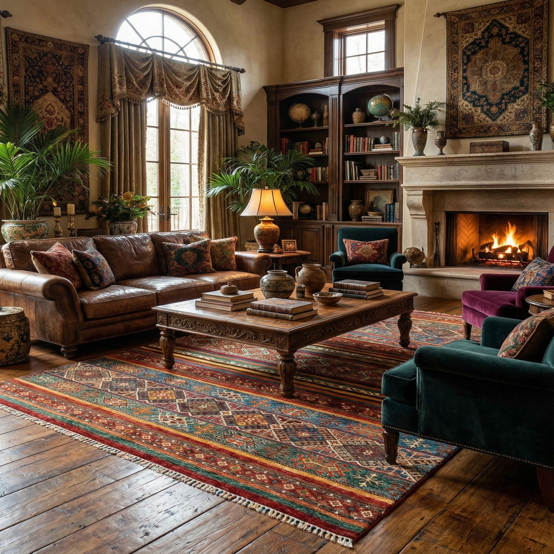 Primary color is Red. Colors in this rug include: Red, Red, Blue, Green, Yellow, Brown.