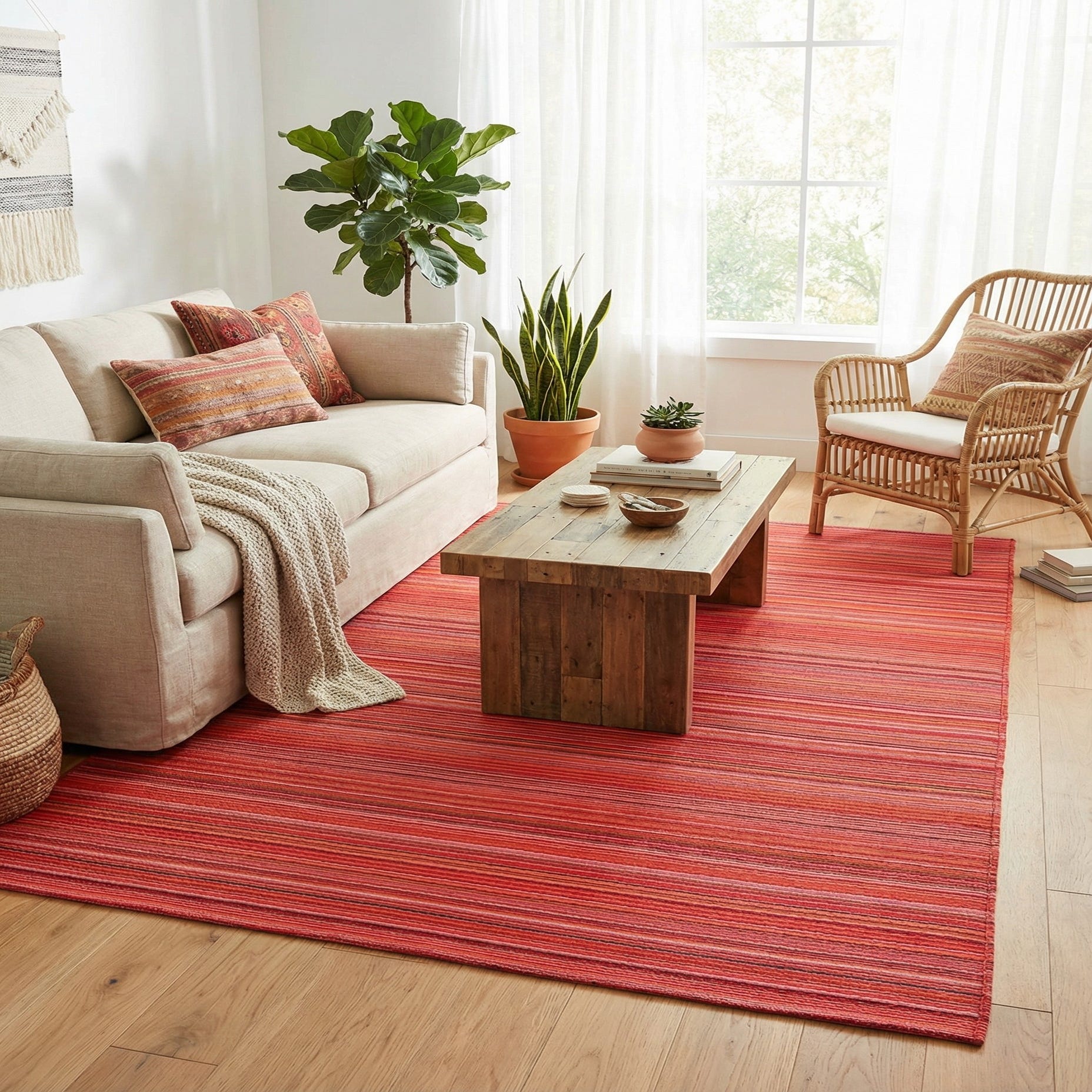Primary color is Red. Colors in this rug include: Red, Pink, Brown, Orange.