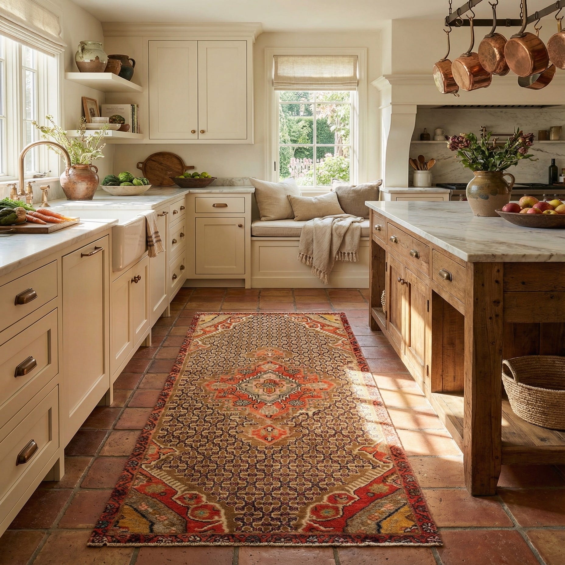 Primary color is Red. Colors in this rug include: Red, Brown, Cream, Dark Blue.