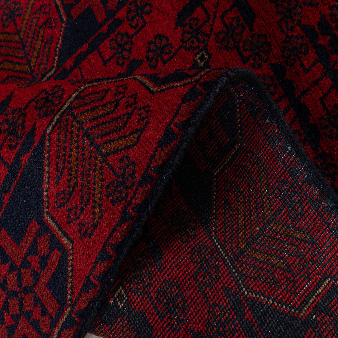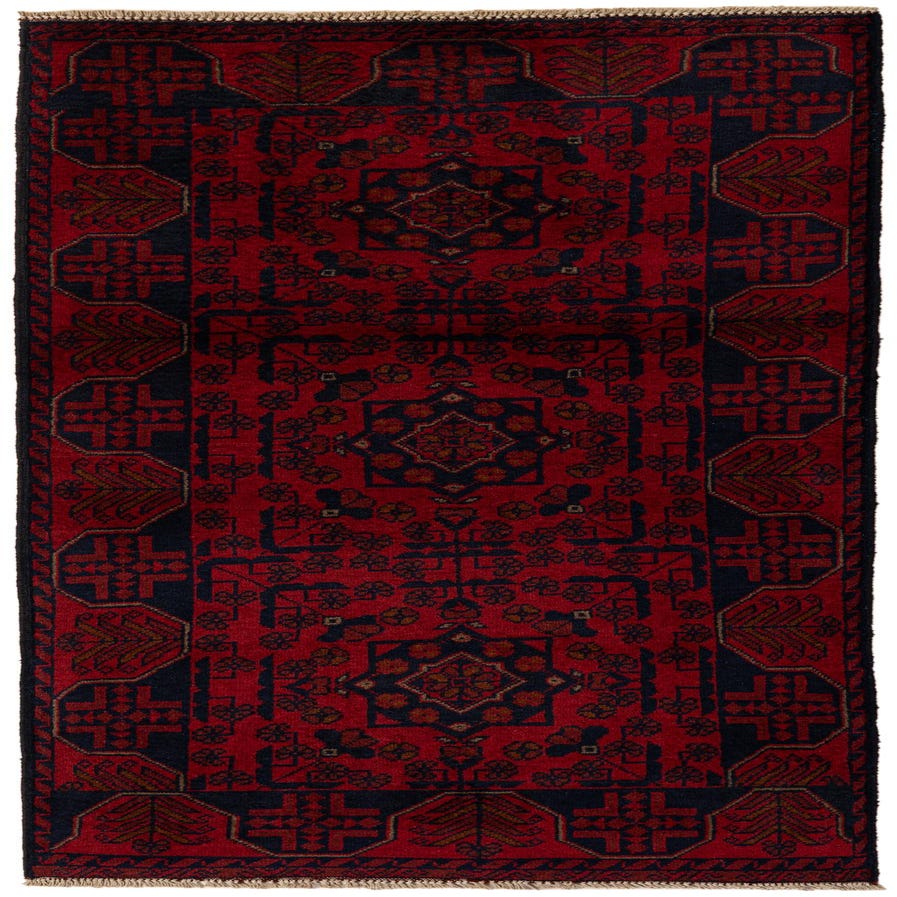 Primary color is Red. Colors in this rug include: Red, Brown, Navy Blue.