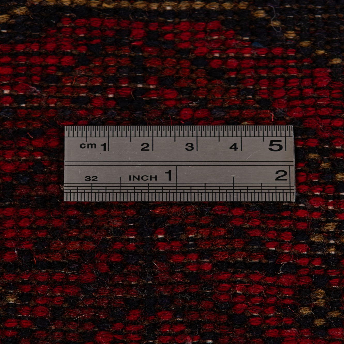 Primary color is Red. Colors in this rug include: Red, Brown, Navy Blue.