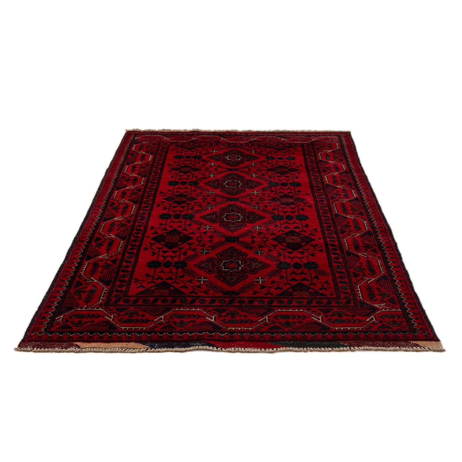 Primary color is Red. Colors in this rug include: Red, Brown, Navy Blue, Green.