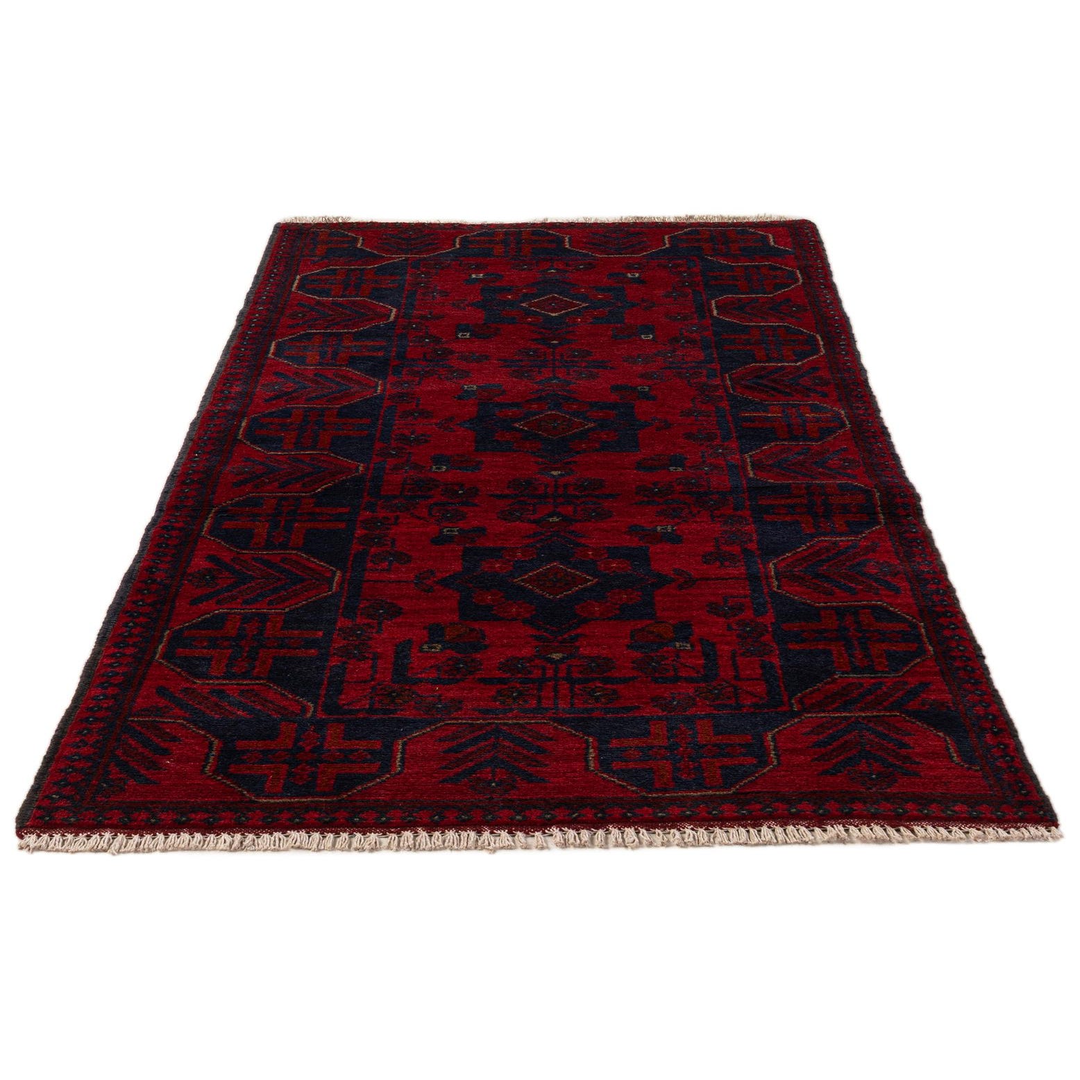 Primary color is Red. Colors in this rug include: Red, Brown, Navy Blue.