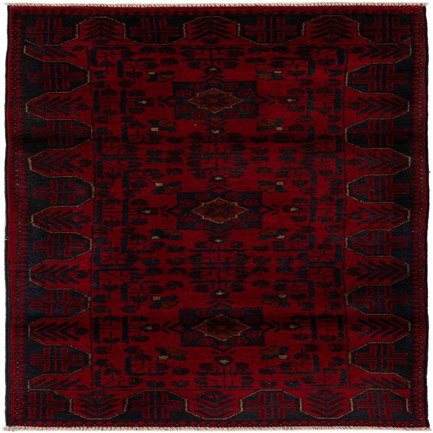 Primary color is Red. Colors in this rug include: Red, Brown, Navy Blue.