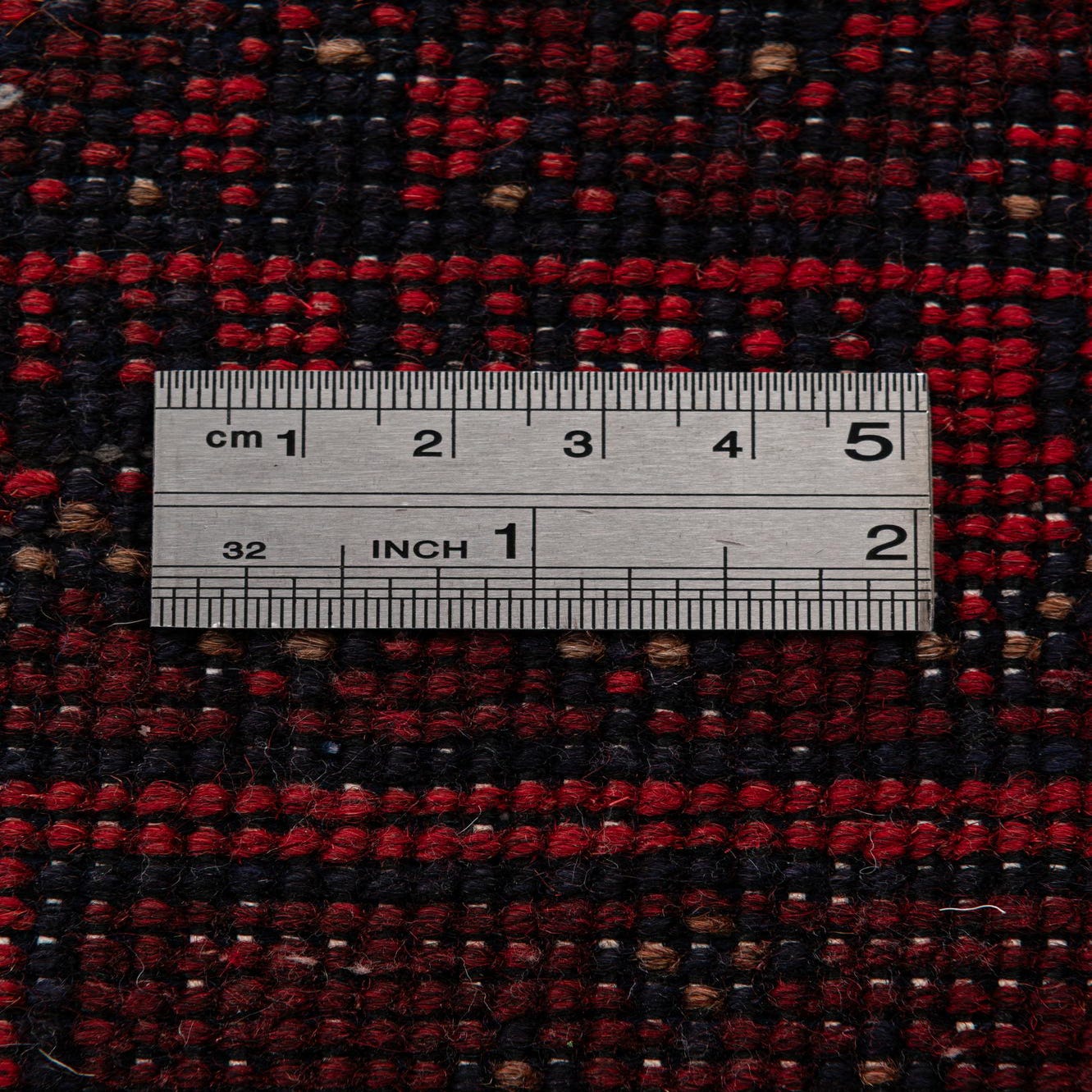 Primary color is Red. Colors in this rug include: Red, Brown, Navy Blue.