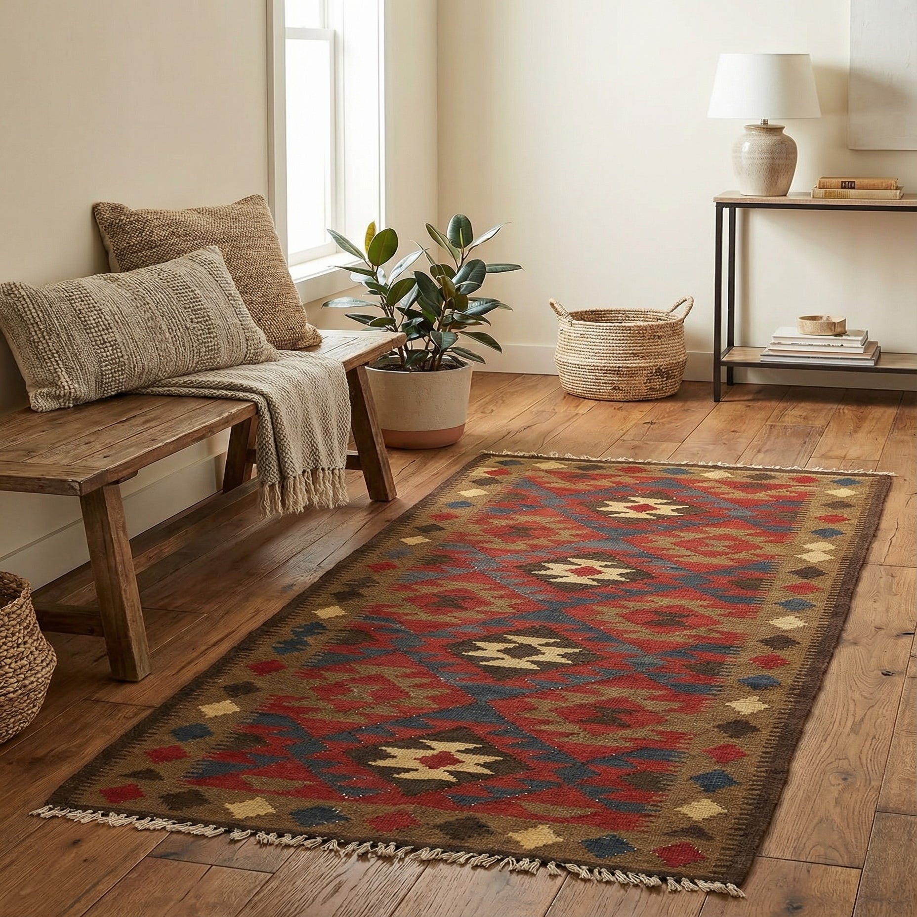 Primary color is Red. Colors in this rug include: Red, Brown, Cream, Light Brown, Navy Blue.
