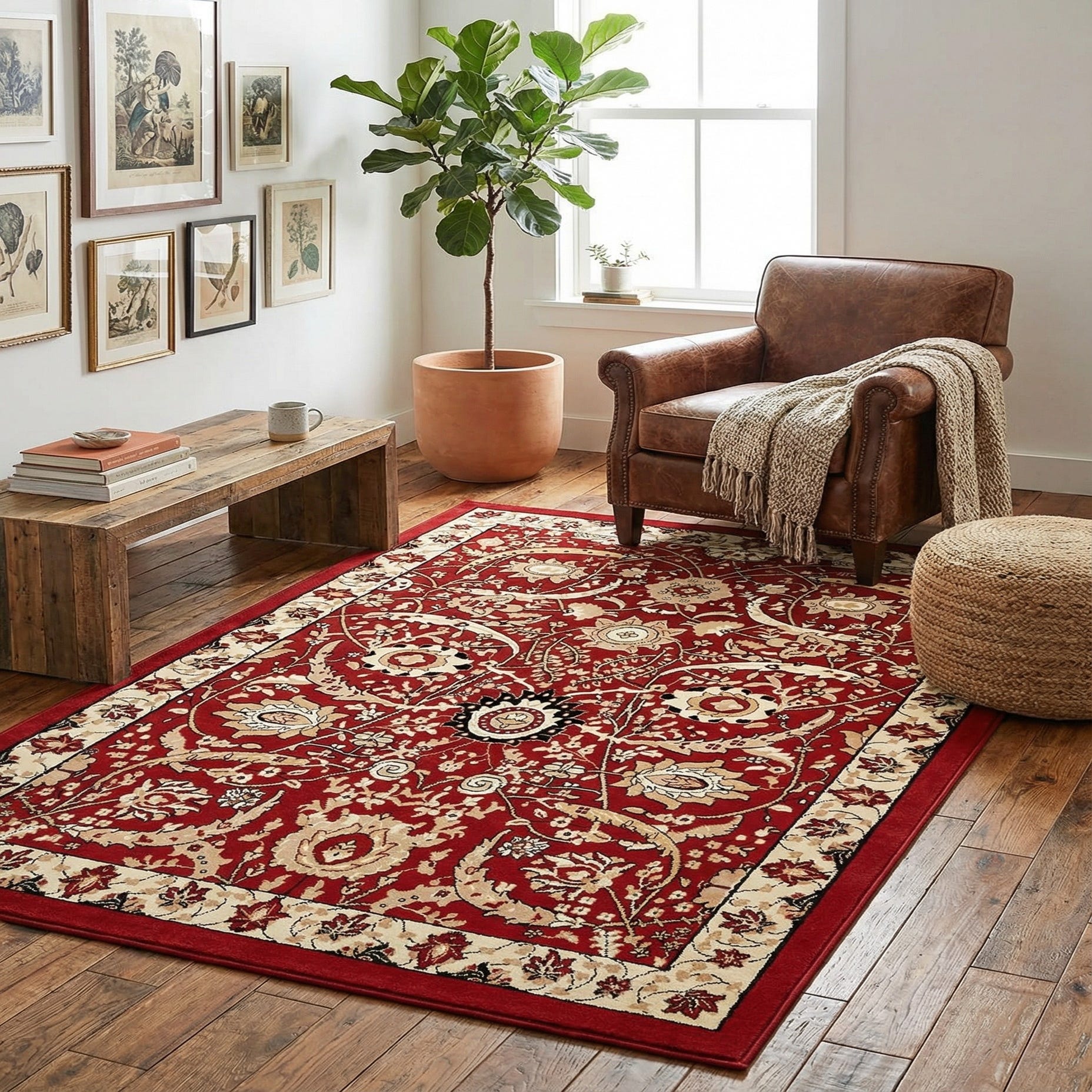 Primary color is Red. Colors in this rug include: Red, Beige, Black, Cream, Tan.