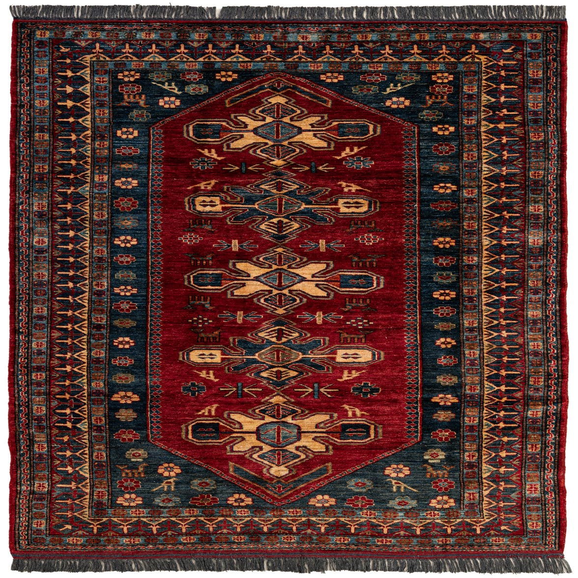 Primary color is Red. Colors in this rug include: Red, Beige, Blue, Brown, Navy Blue, Tan, Green.