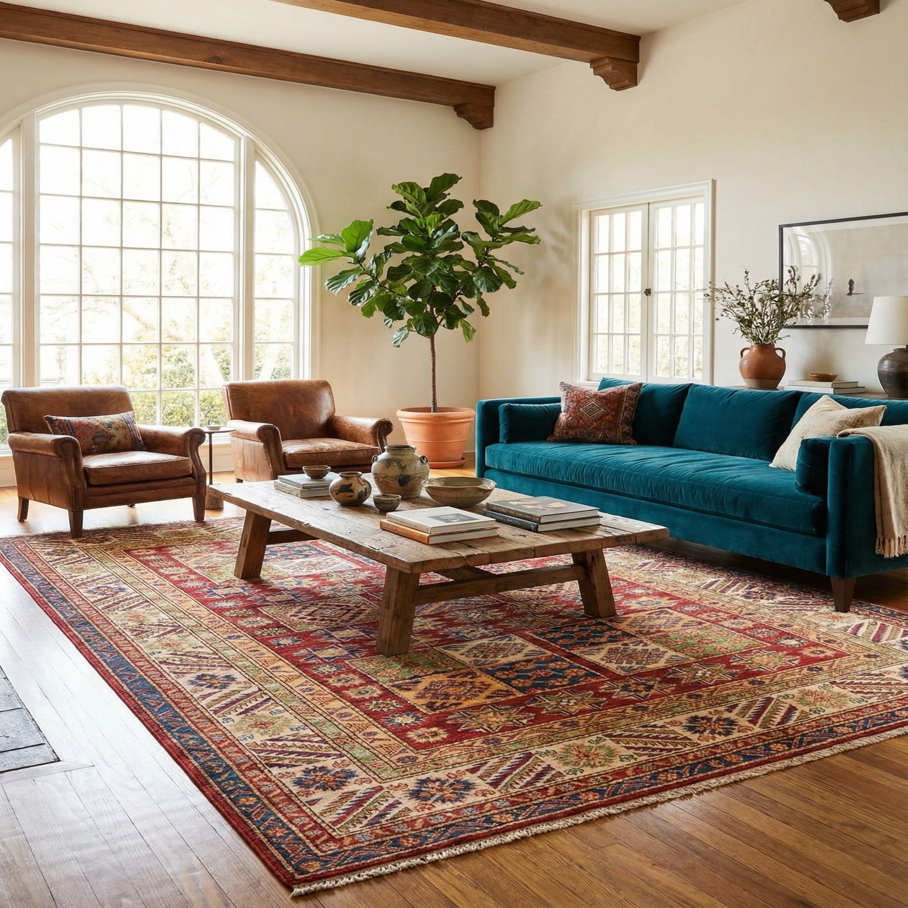 Primary color is Red. Colors in this rug include: Red, Black, Blue, Brown, Cream, Green, Navy Blue, Olive, Orange, Peach.