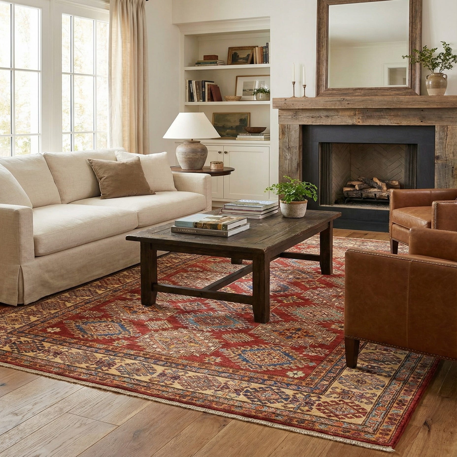 Primary color is Red. Colors in this rug include: Red, Black, Blue, Brown, Cream, Green, Navy Blue, Terracotta, Salmon.