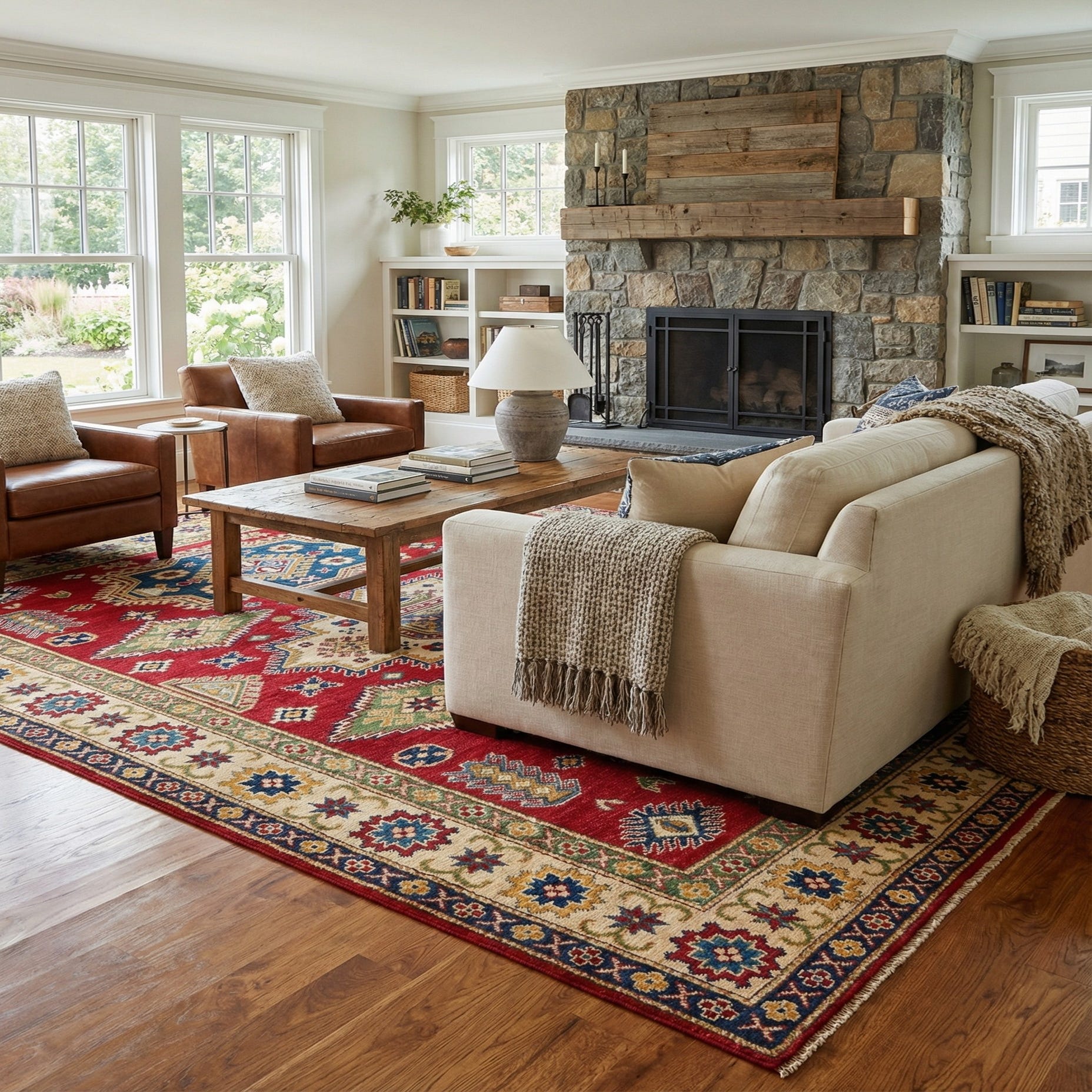 Primary color is Red. Colors in this rug include: Red, Blue, Brown, Navy Blue, Green, Yellow.