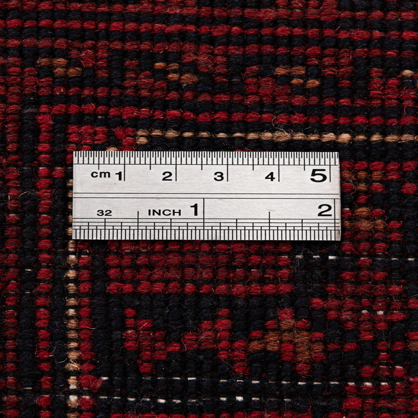 Primary color is Red. Colors in this rug include: Red, Brown, Navy Blue.