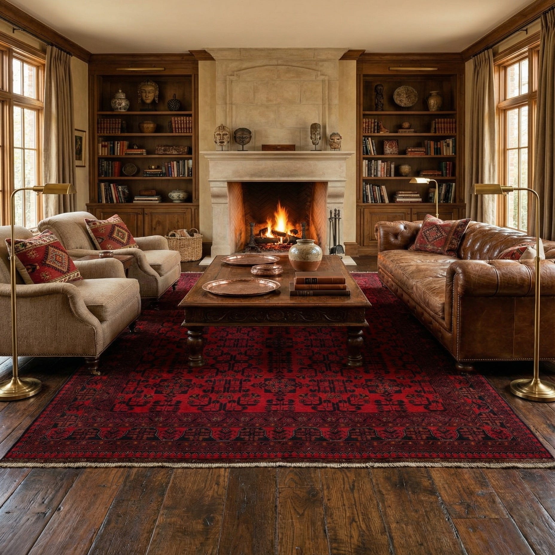 Primary color is Red. Colors in this rug include: Red, Brown, Navy Blue.