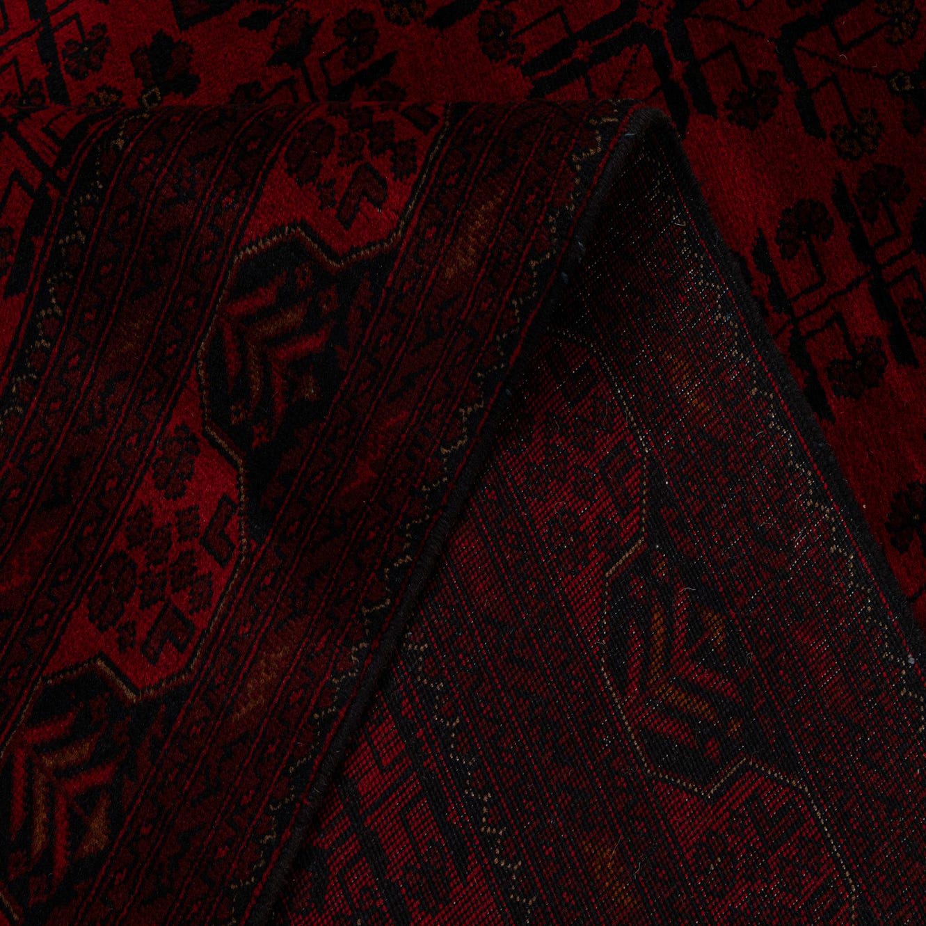 Primary color is Red. Colors in this rug include: Red, Black, Brown.
