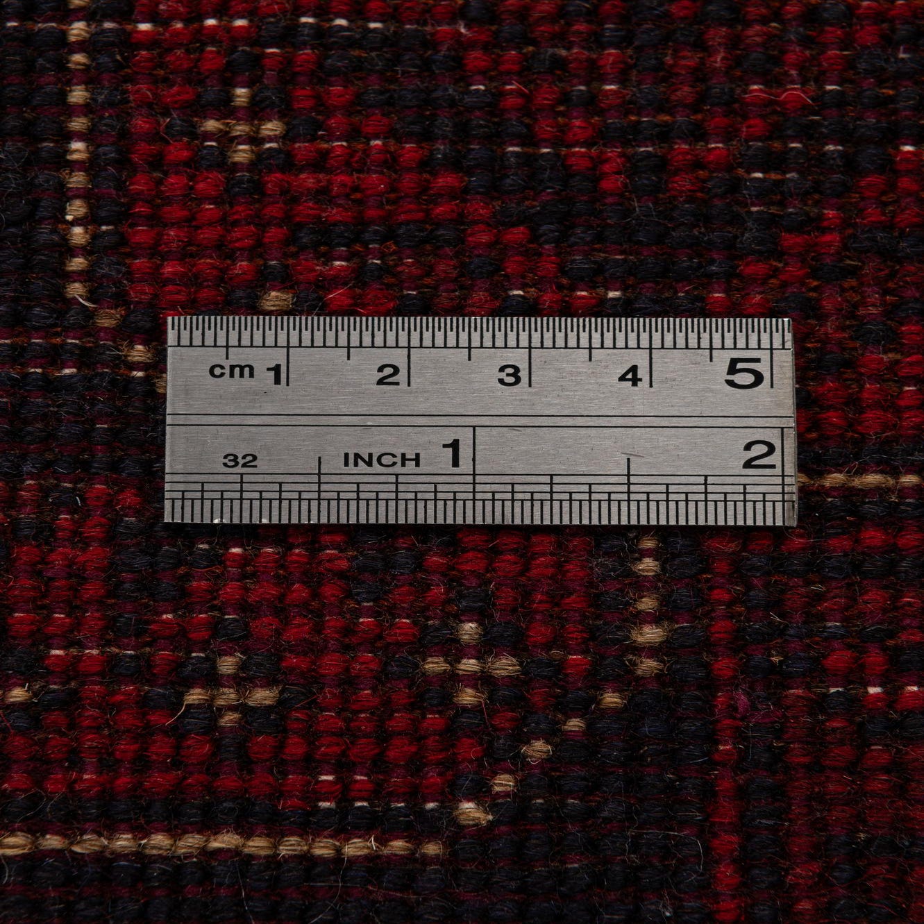 Primary color is Red. Colors in this rug include: Red, Black, Brown.