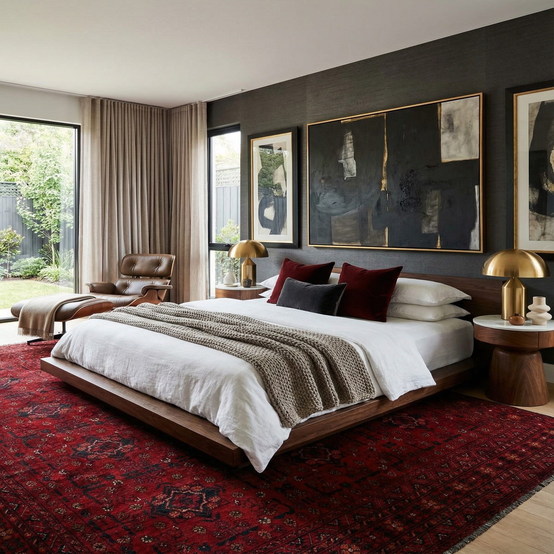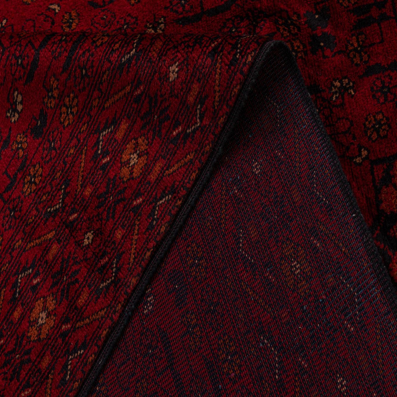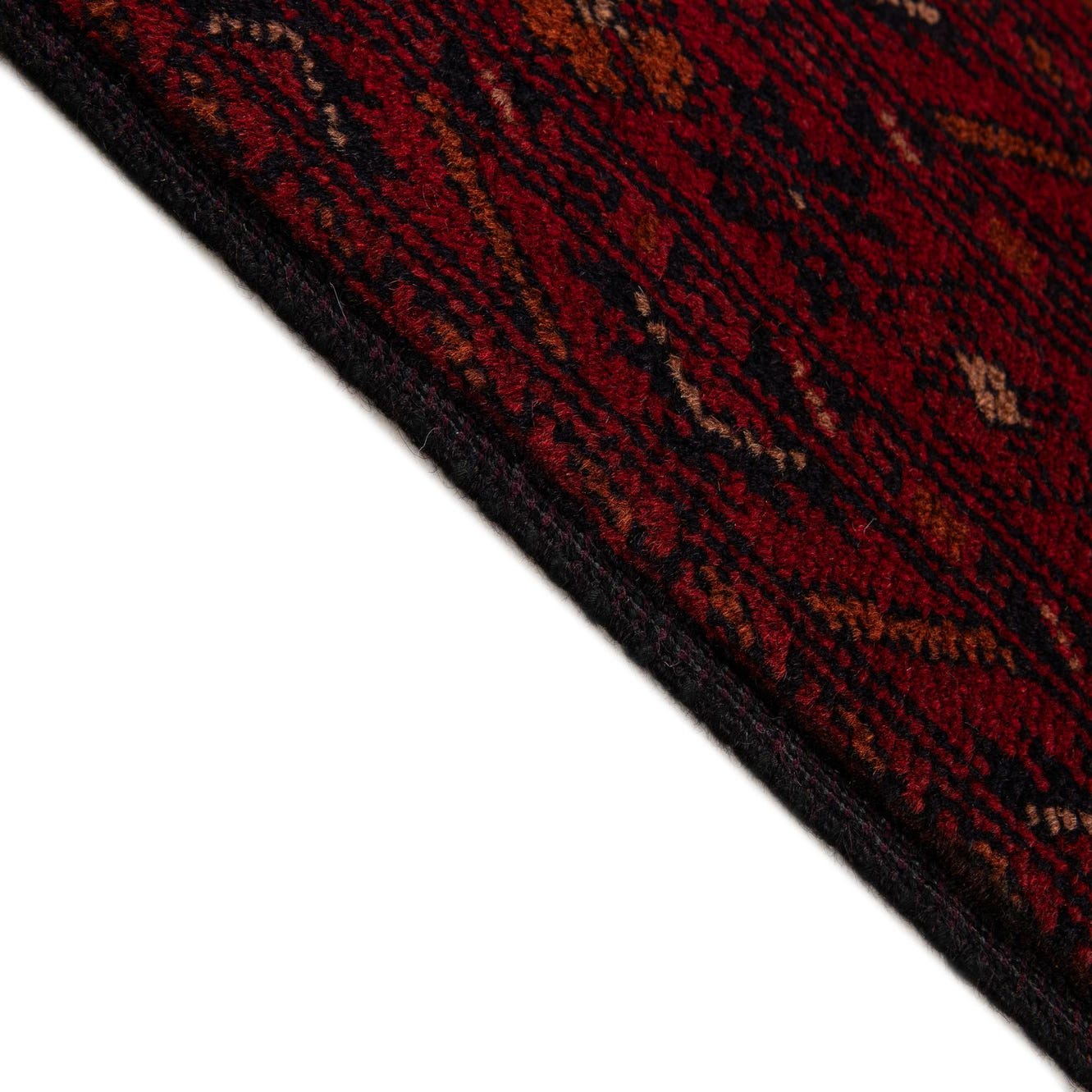 Primary color is Red. Colors in this rug include: Red, Brown, Navy Blue.