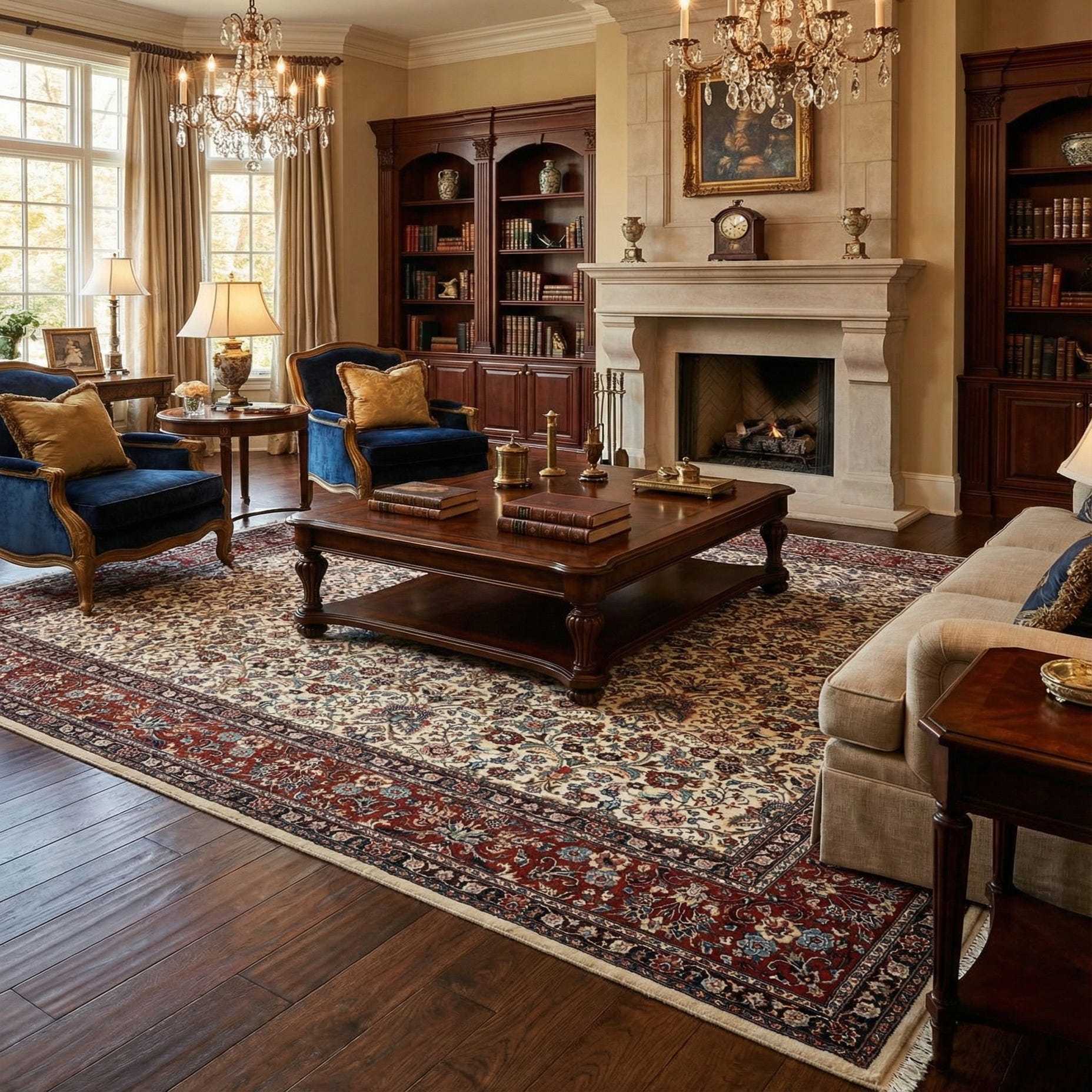 Primary color is Red. Colors in this rug include: Red, Red, Cream, Dark Blue, Brown, Blue, Olive, Orange, Grey, Pink.