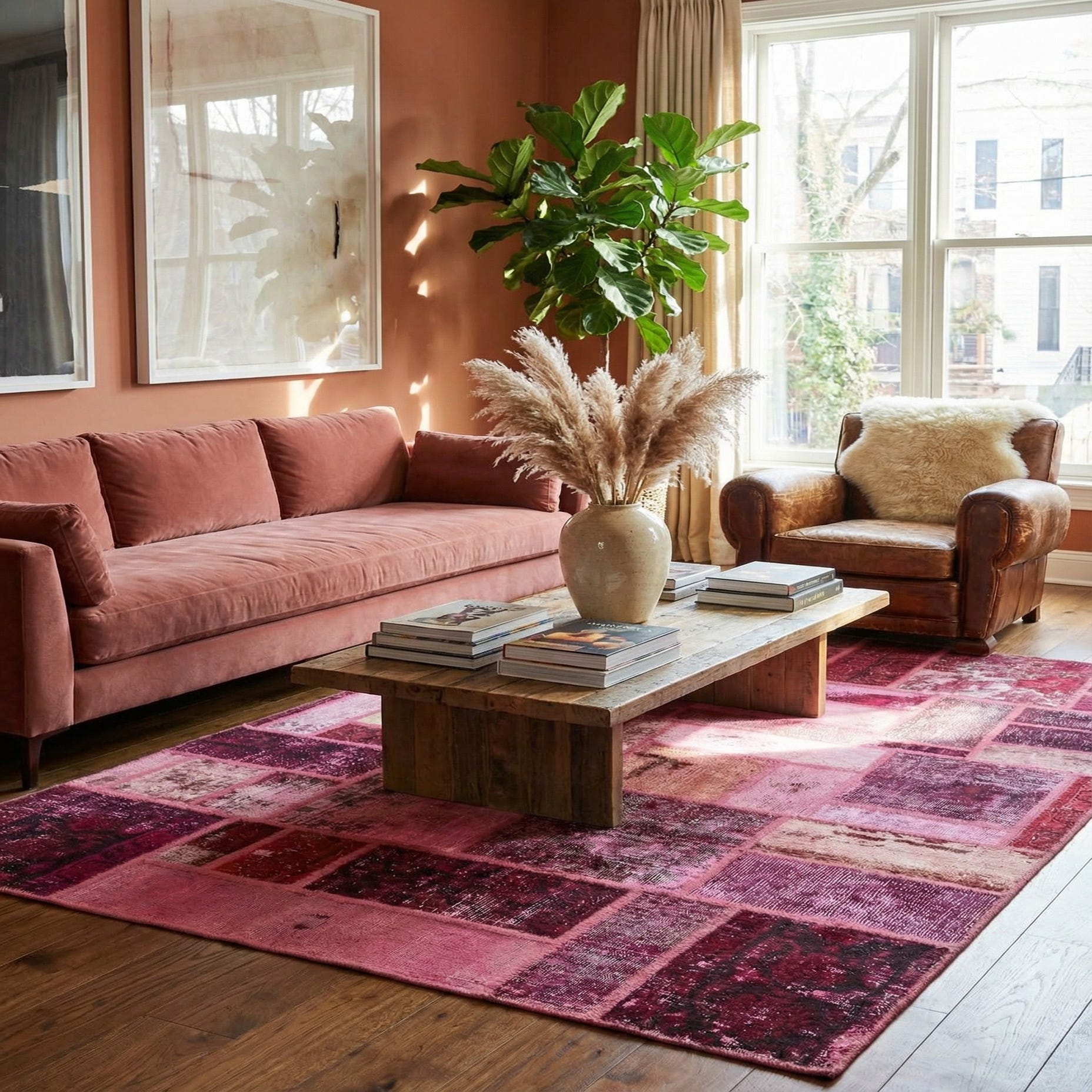 Primary color is Red. Colors in this rug include: Red, Ivory, Navy Blue, Peach, Puce, Pink, Salmon.