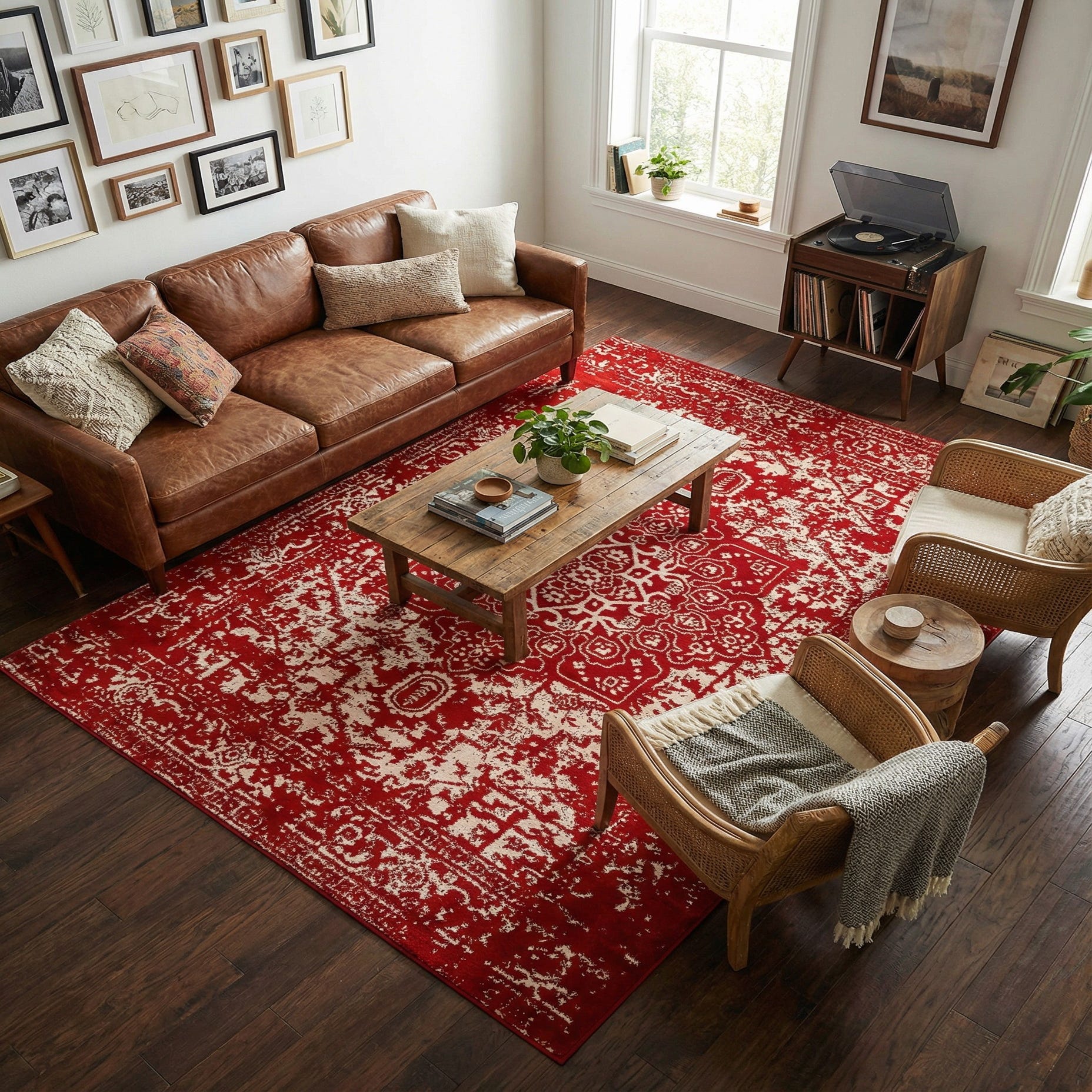 Primary color is Red. Colors in this rug include: Red, Ivory.
