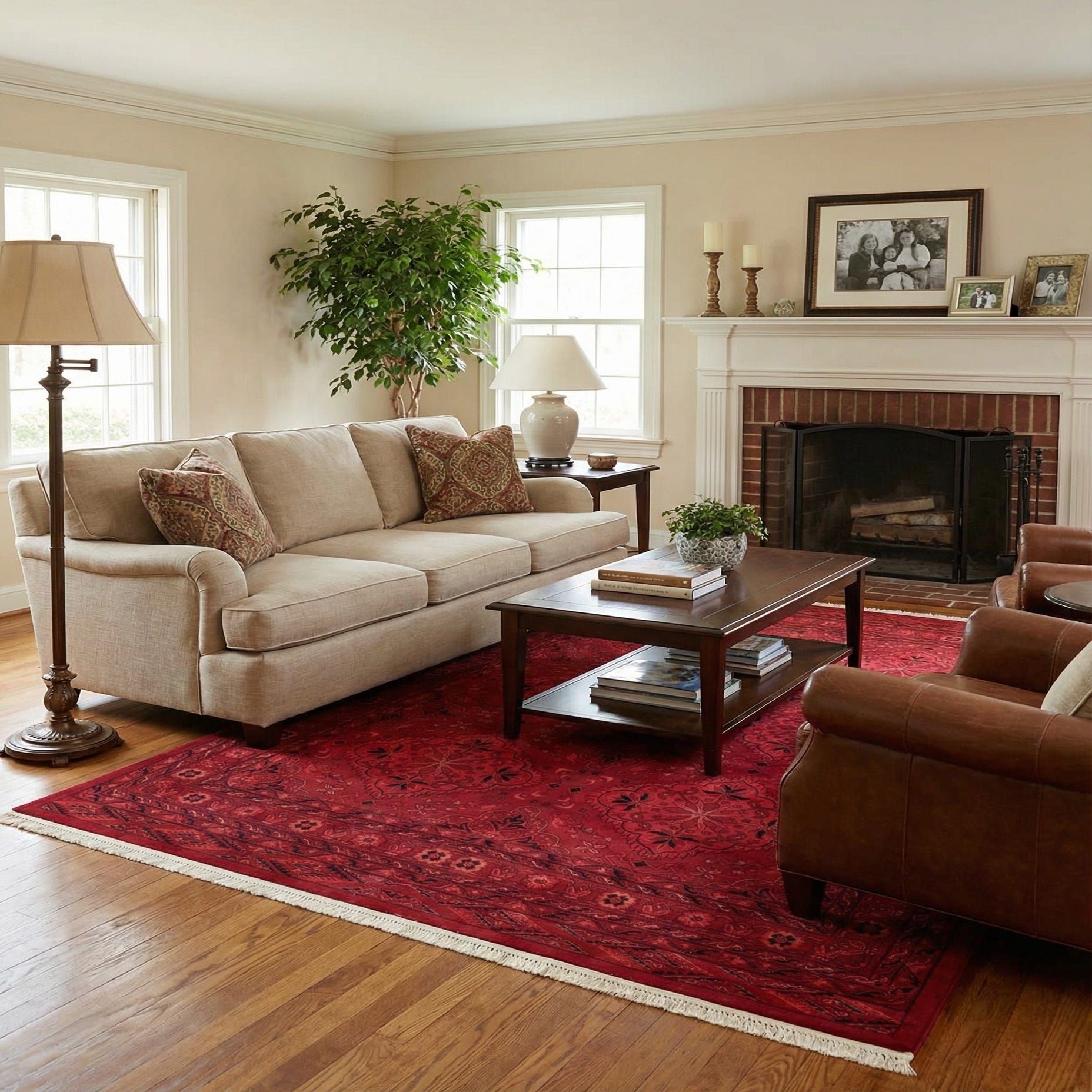 Primary color is Red. Colors in this rug include: Red, Black, Cream, Terracotta.