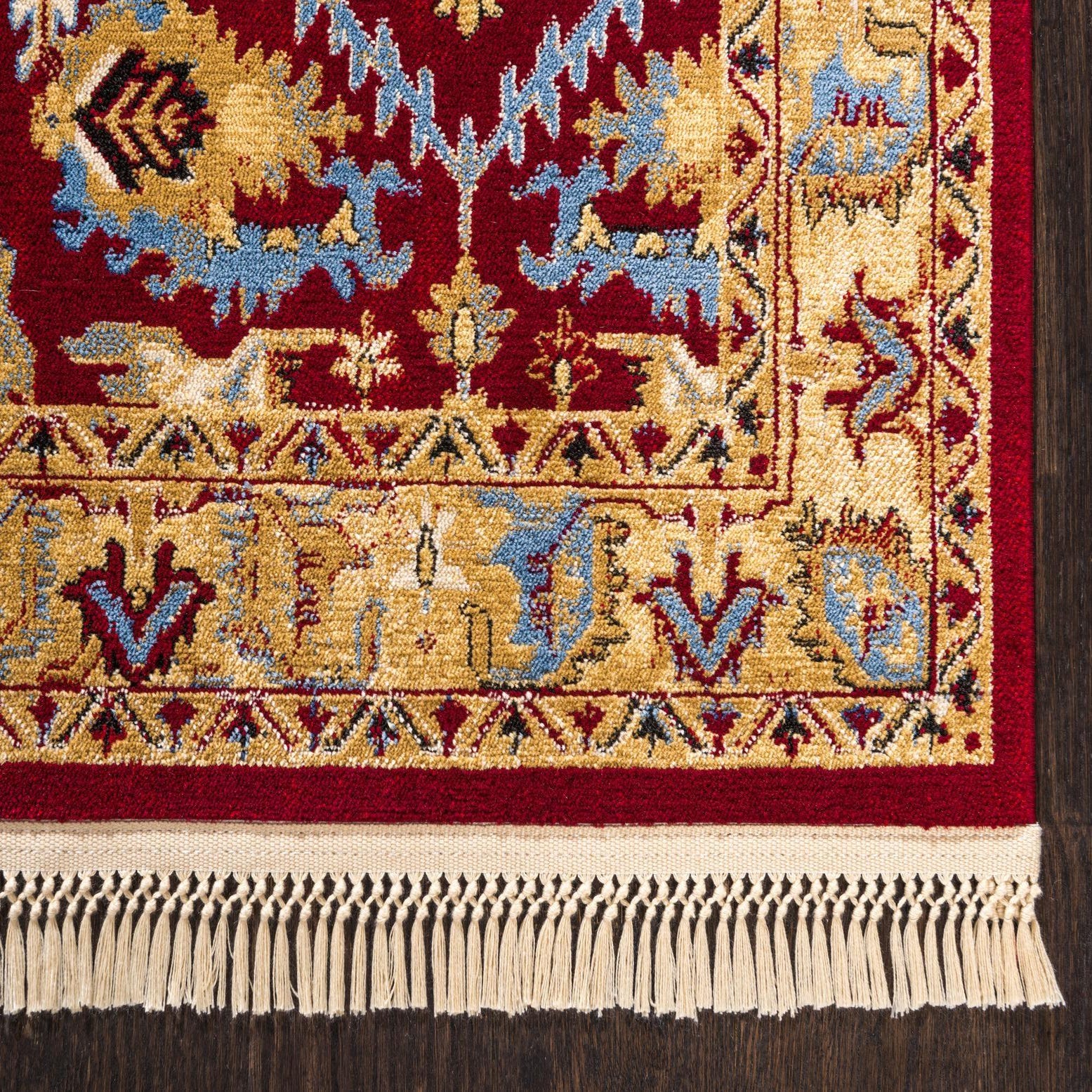 Primary color is Red. Colors in this rug include: Red, Beige, Black, Blue, Ivory.