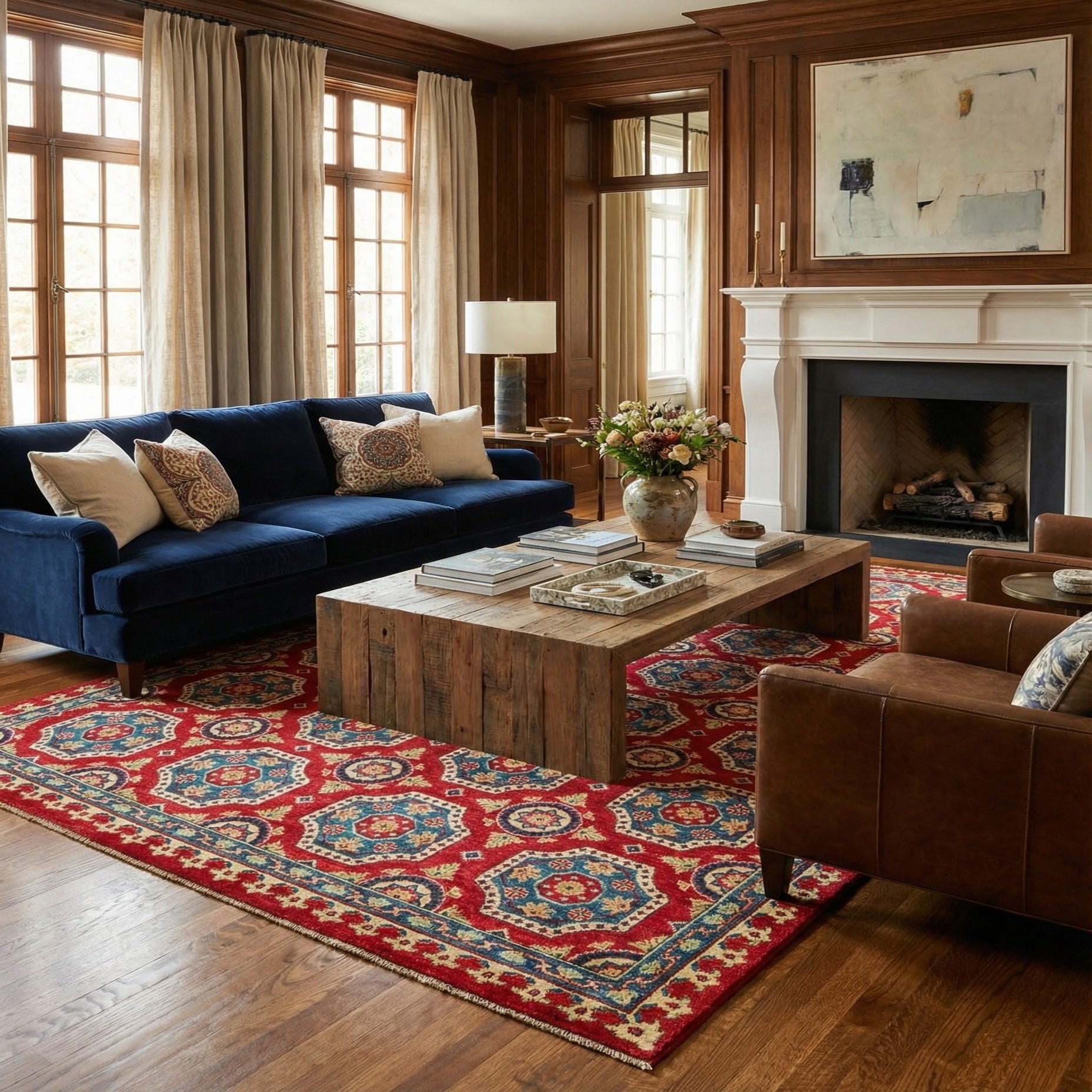 Primary color is Red. Colors in this rug include: Red, Blue, Brown, Ivory, Yellow, Green.