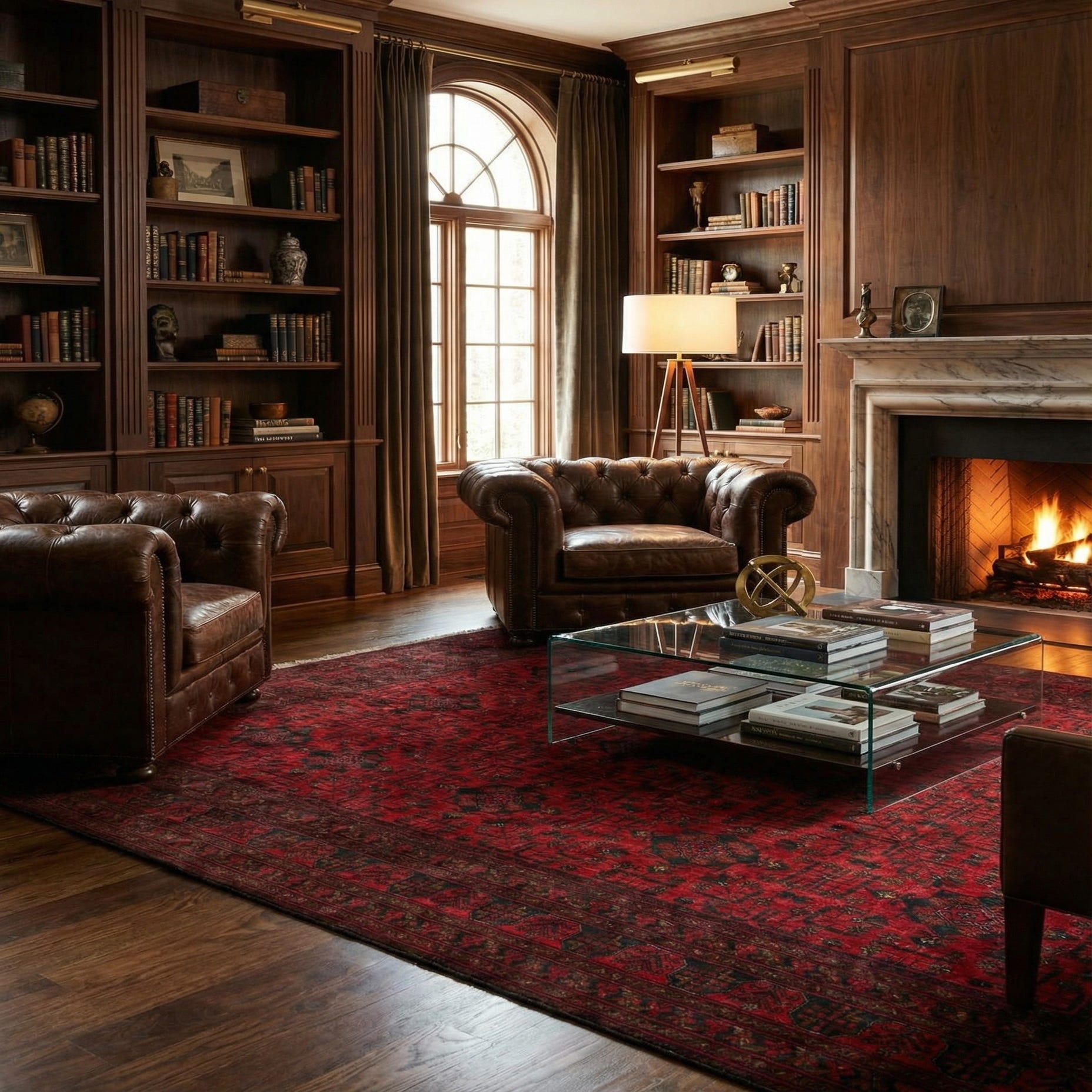 Primary color is Red. Colors in this rug include: Red, Brown, Navy Blue.