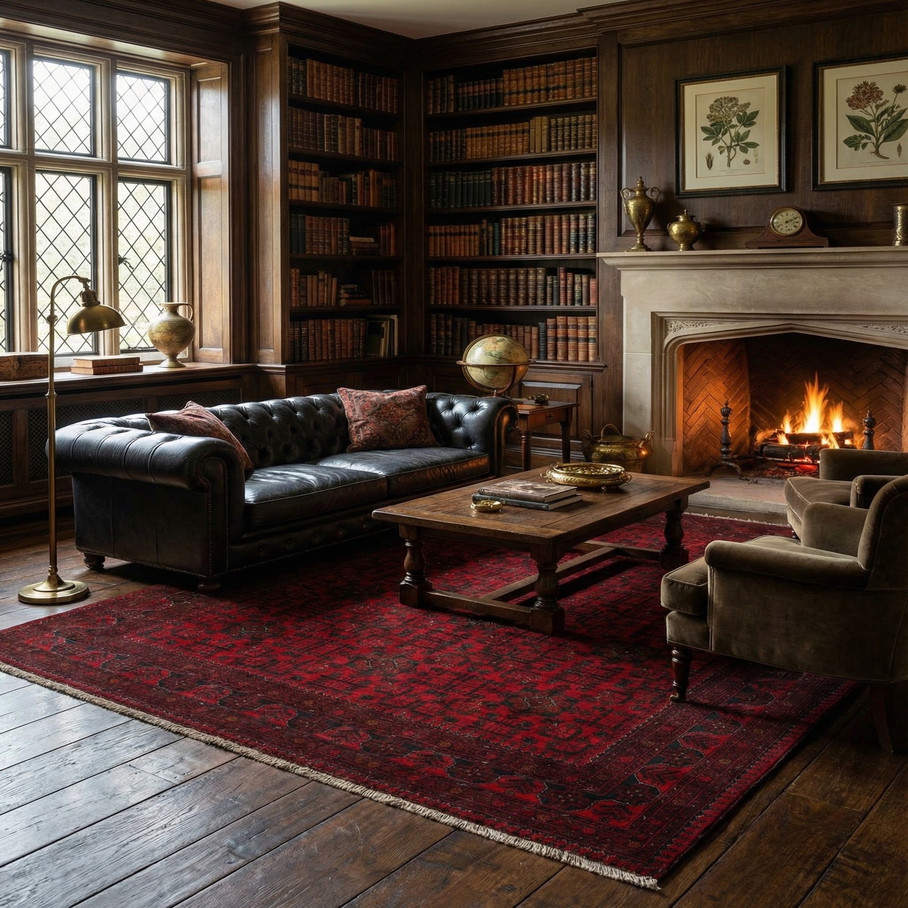 Primary color is Red. Colors in this rug include: Red, Brown, Navy Blue.