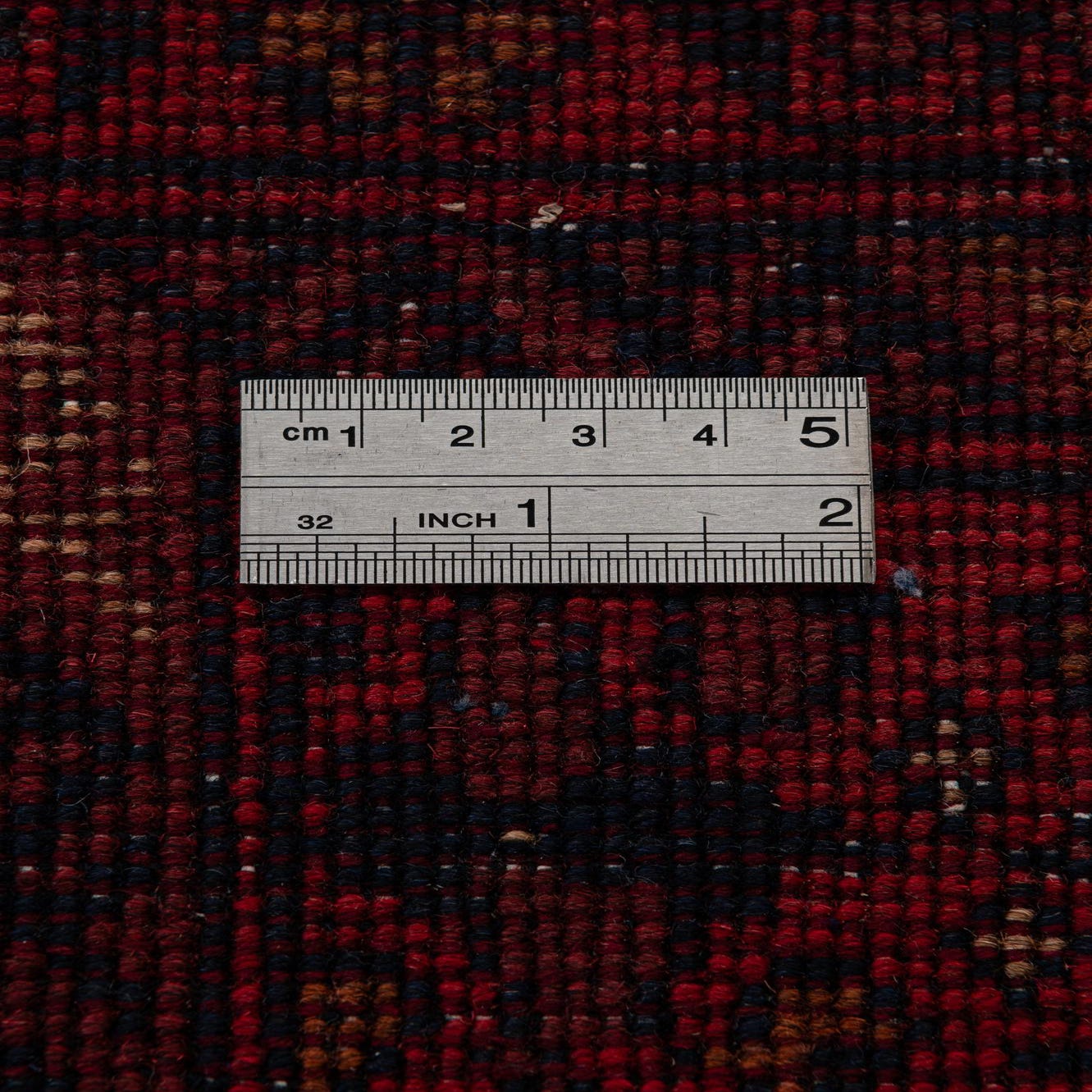 Primary color is Red. Colors in this rug include: Red, Brown, Navy Blue.