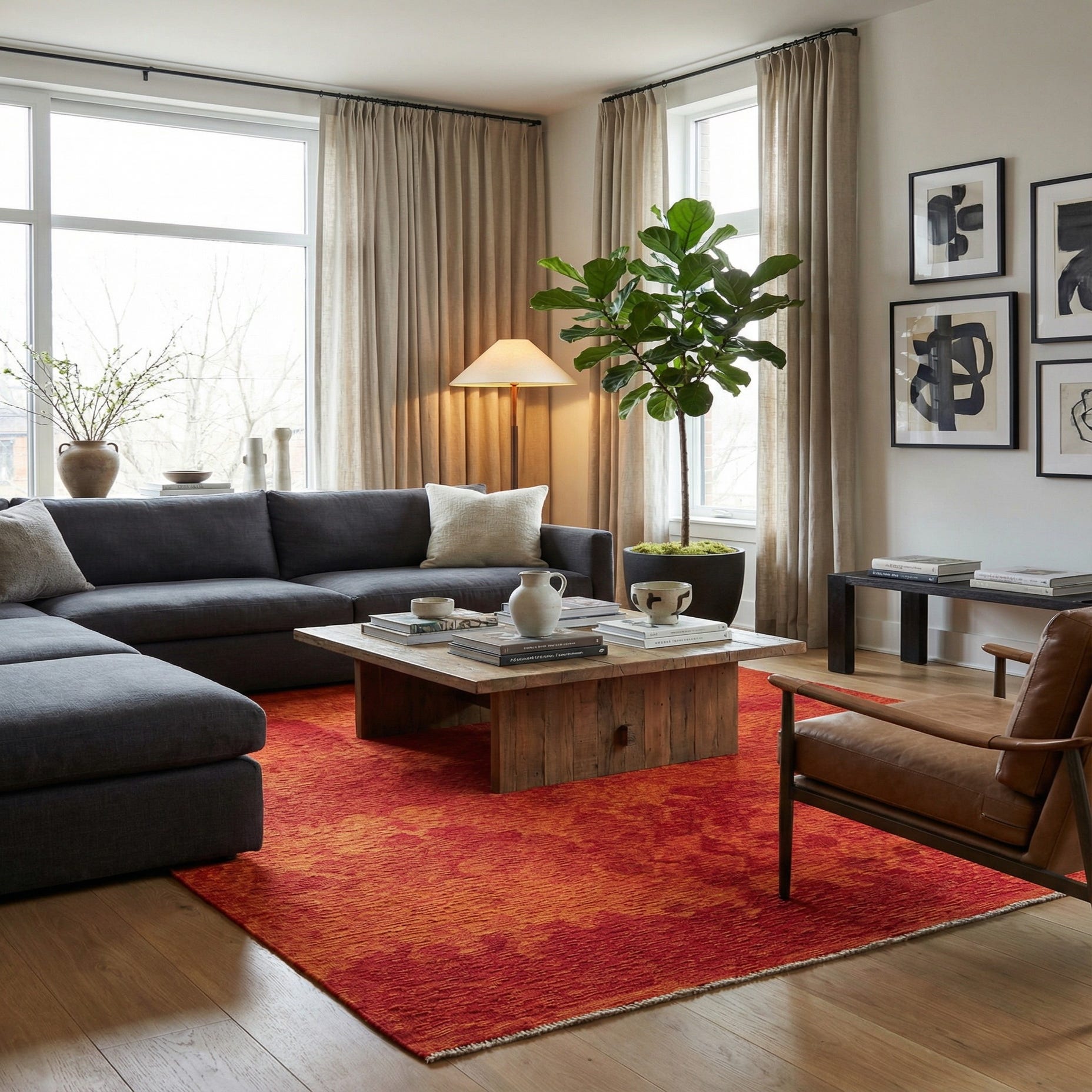 Primary color is Red. Colors in this rug include: Red, Orange.