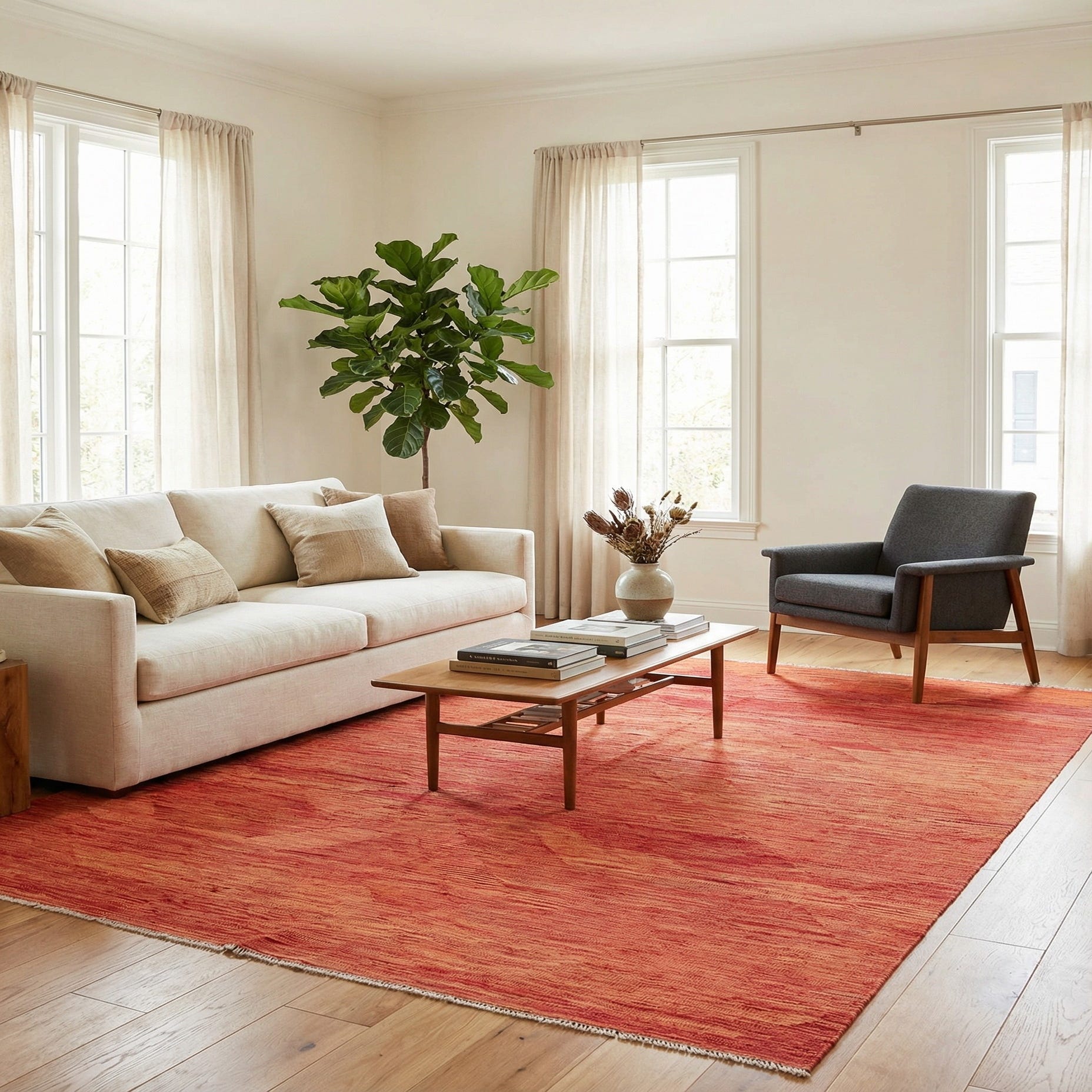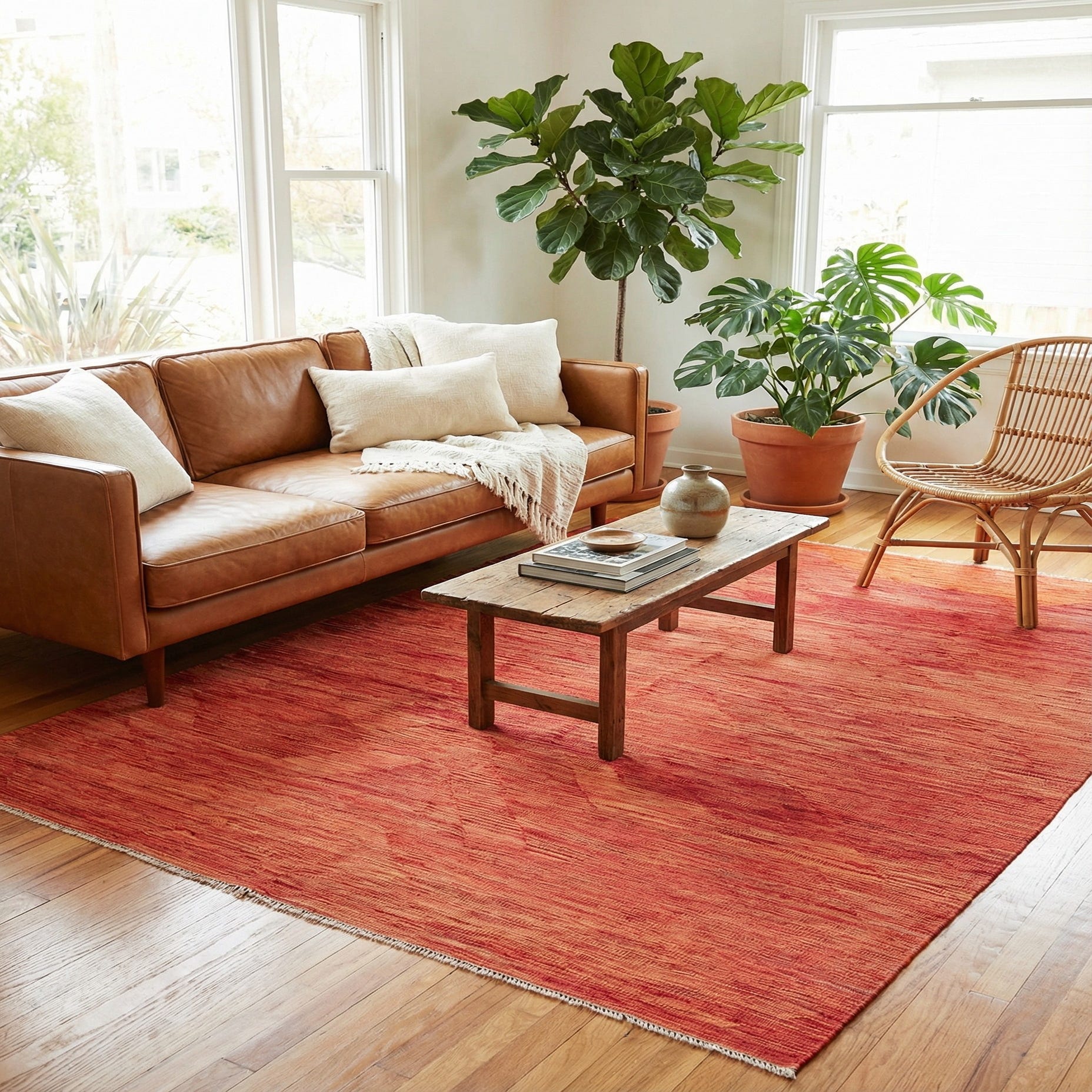 Primary color is Red. Colors in this rug include: Red, Orange, Beige.