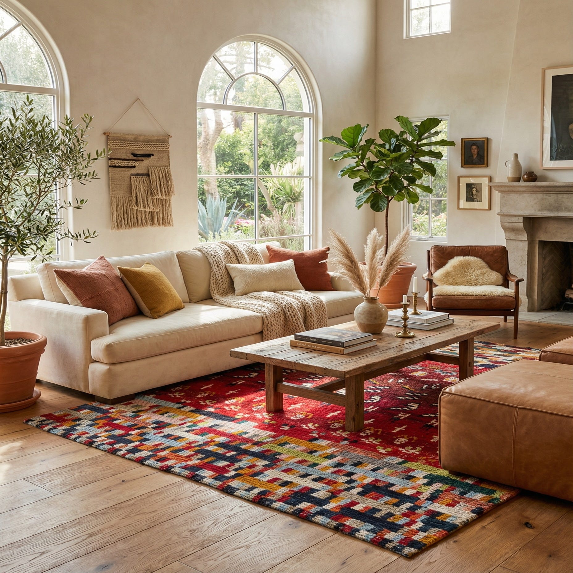 Primary color is Red. Colors in this rug include: Red, Beige, Black, Brown, Ivory, Light Blue, Terracotta, Pink.