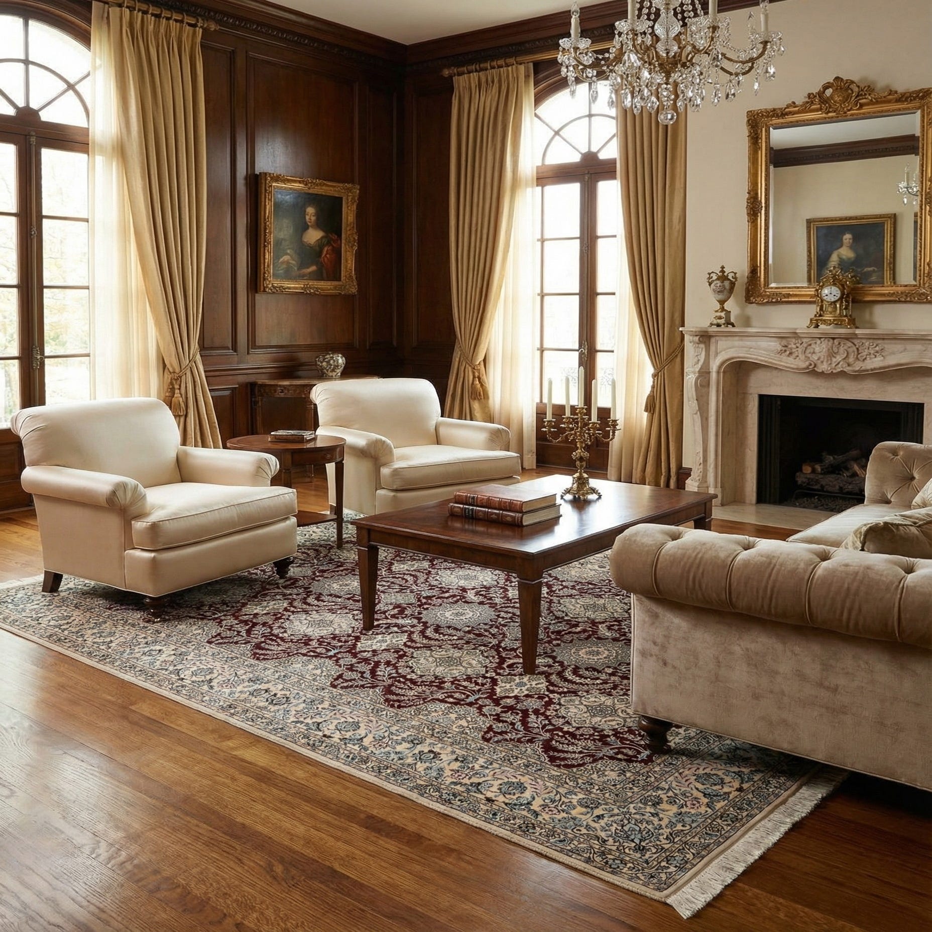 Primary color is Red. Colors in this rug include: Red, Beige.